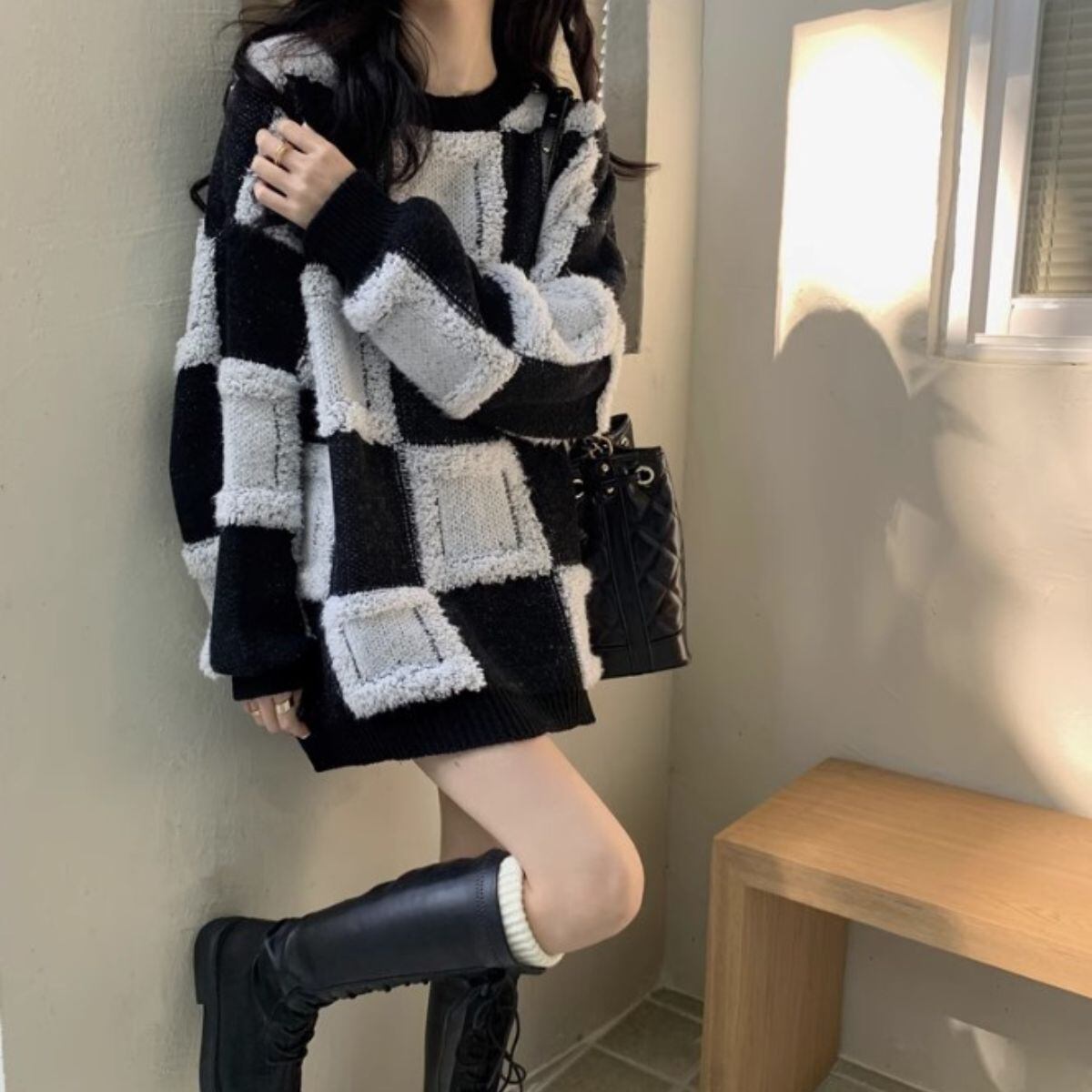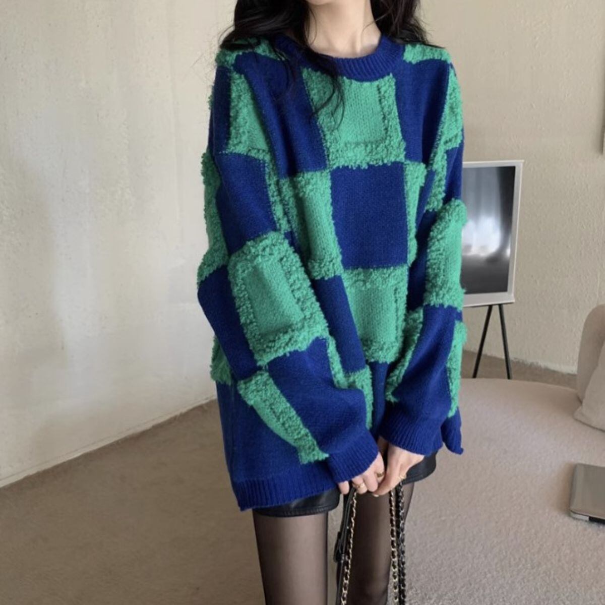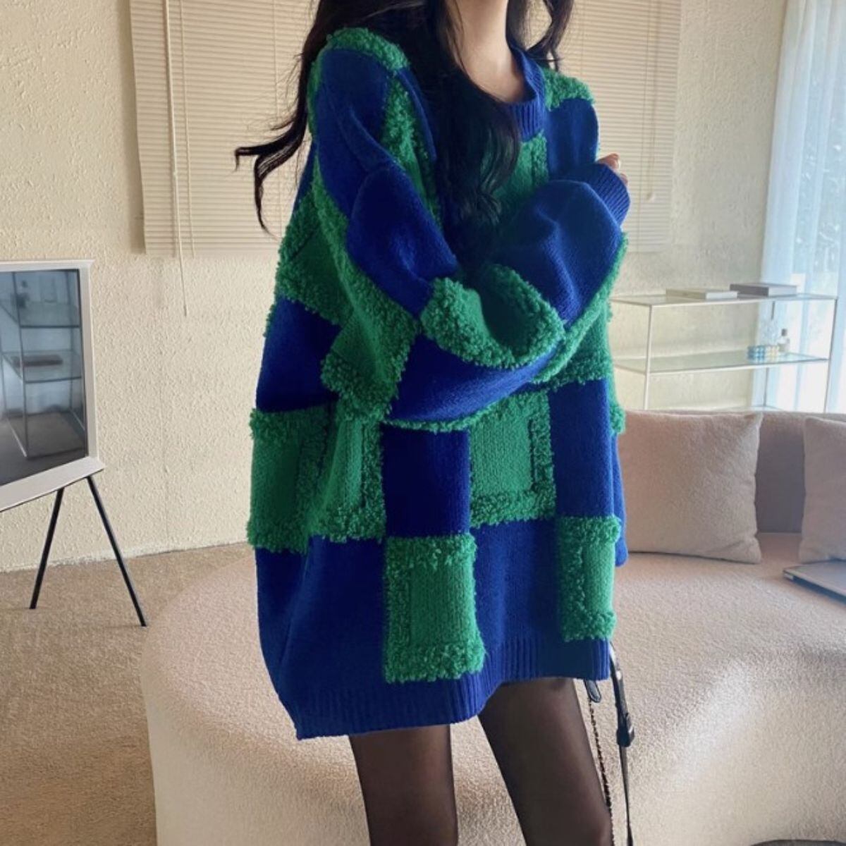 ニット 長袖 レディース 厚手 あたたかい 派手 総柄 防寒 チェッカー 韓国ファッション 柄 あっ