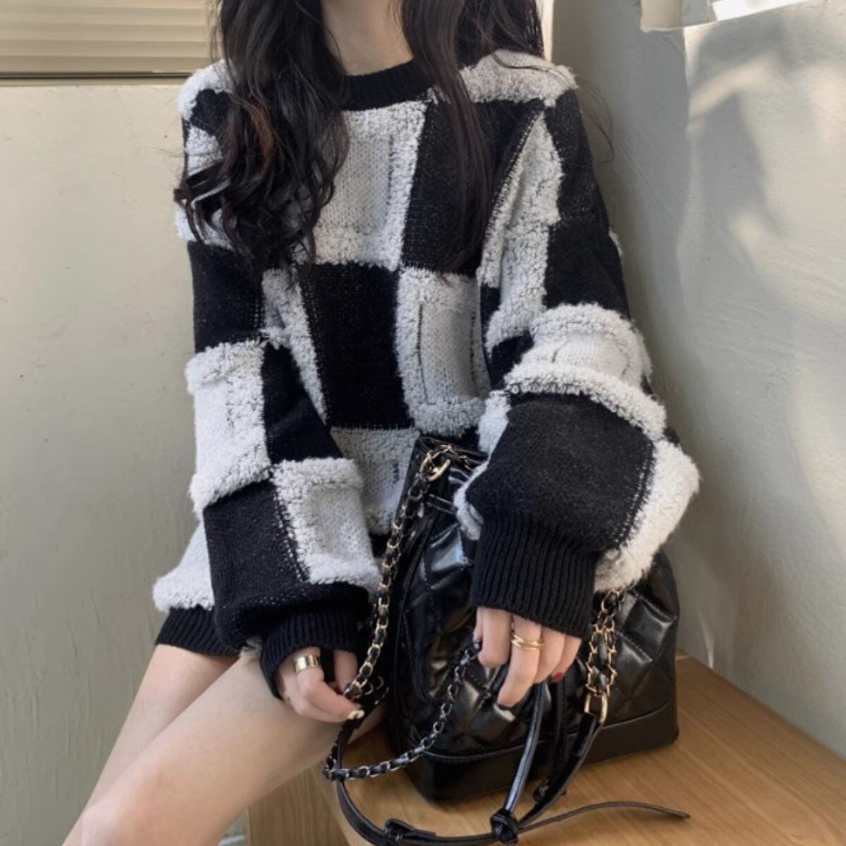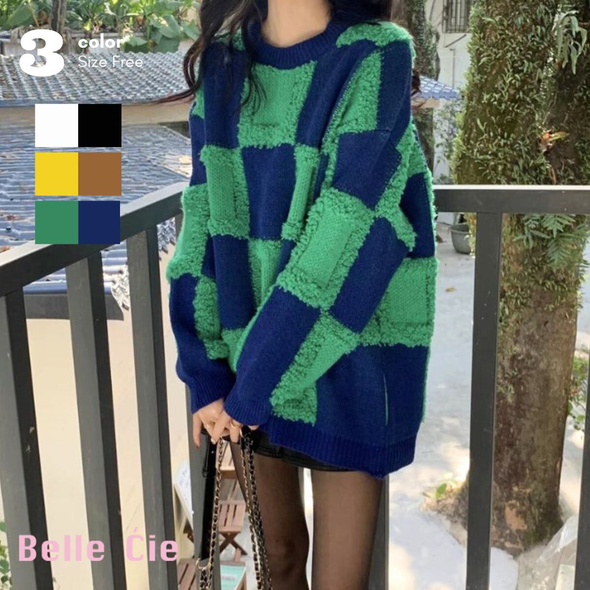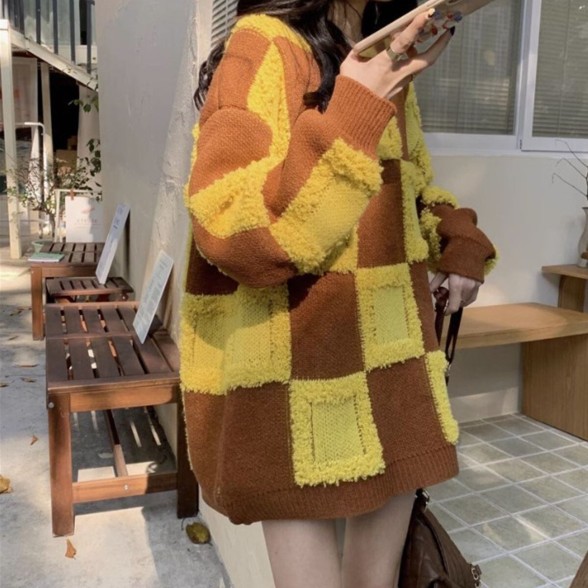 ニット 長袖 レディース 厚手 あたたかい 派手 総柄 防寒 チェッカー 韓国ファッション 柄 あっ