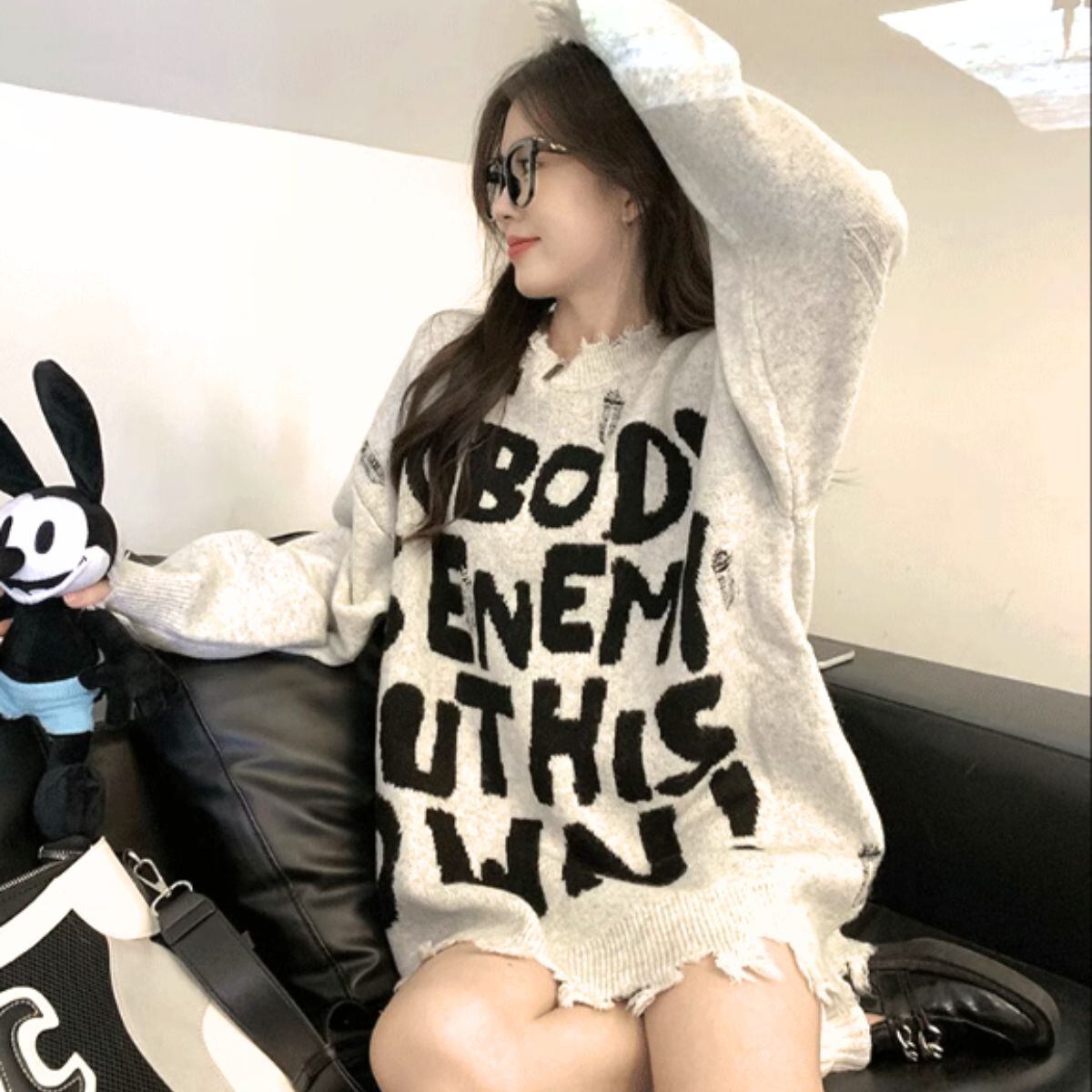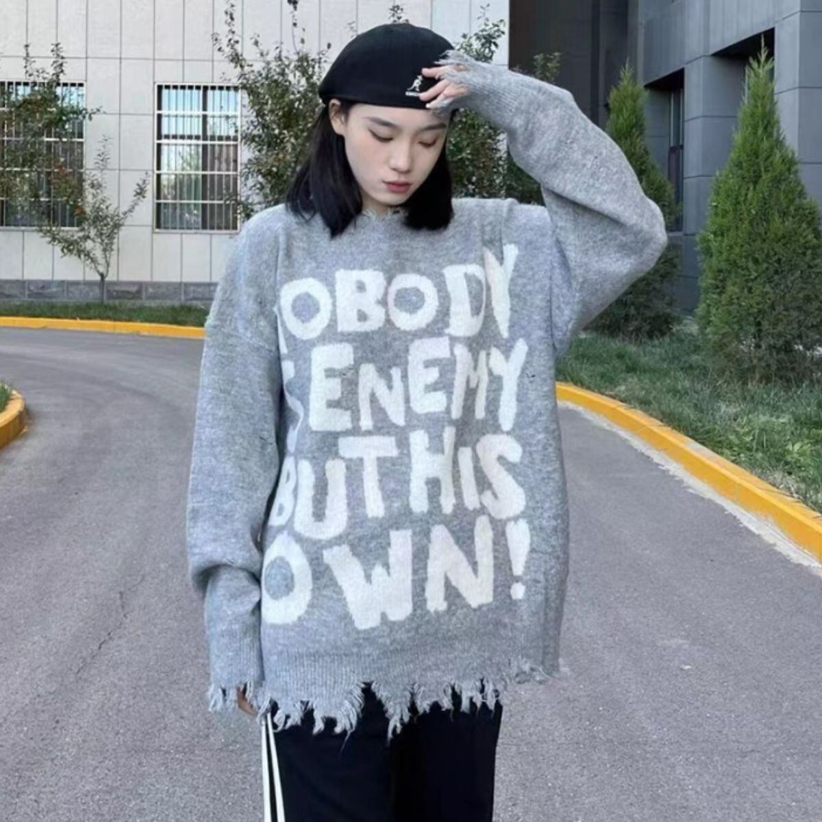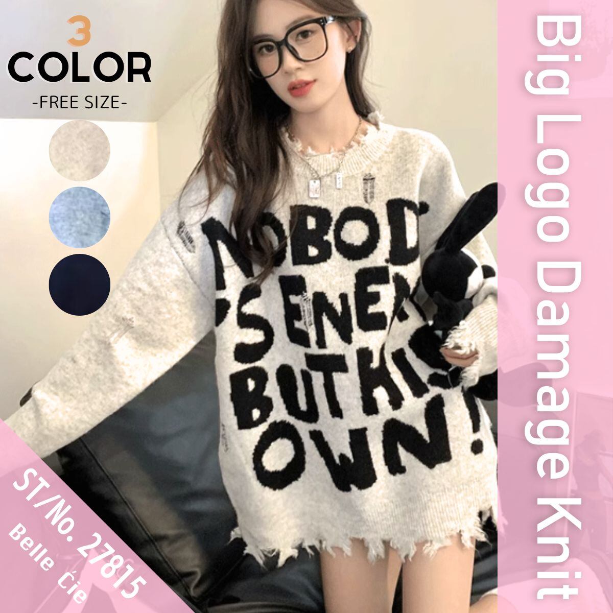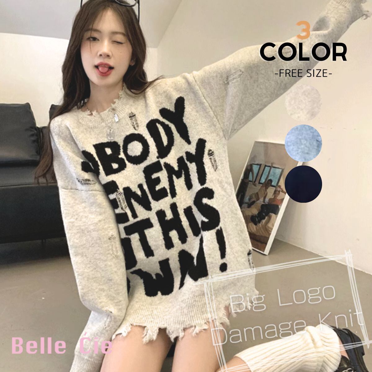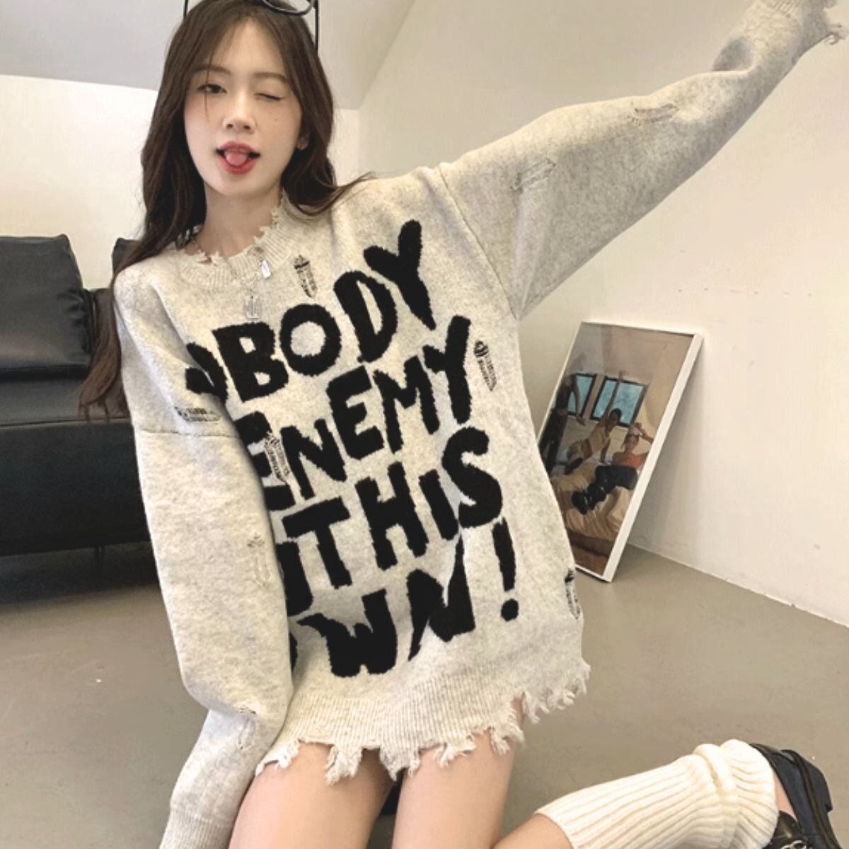 ニット セーター 長袖 ゆったり ロゴ パンク バンド ストリート レディース 韓国ファッション 白