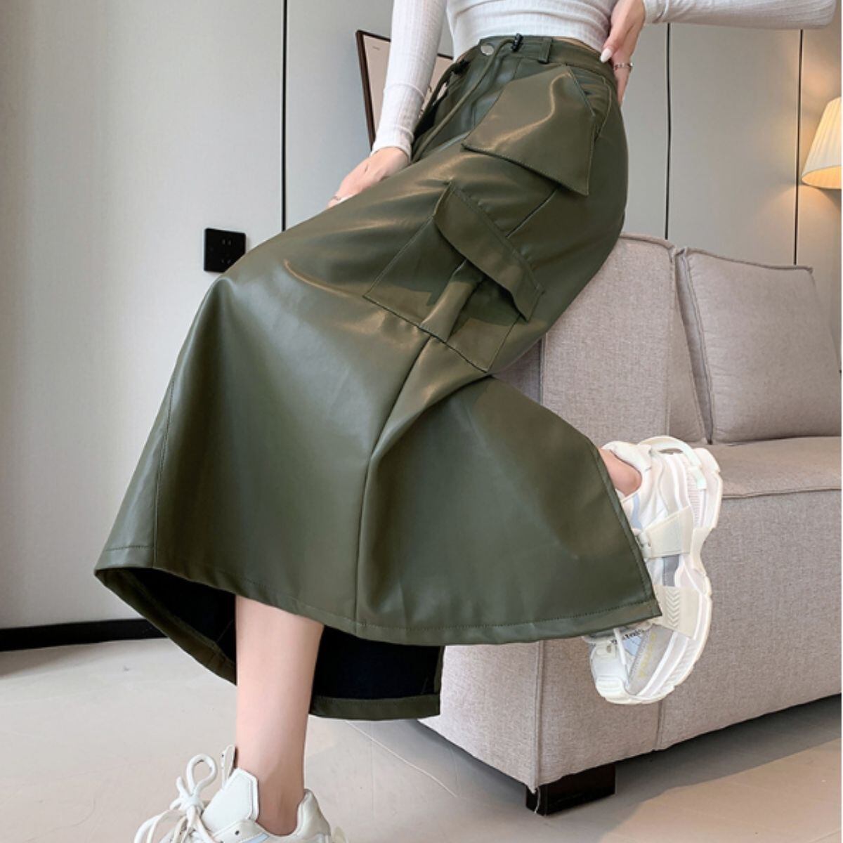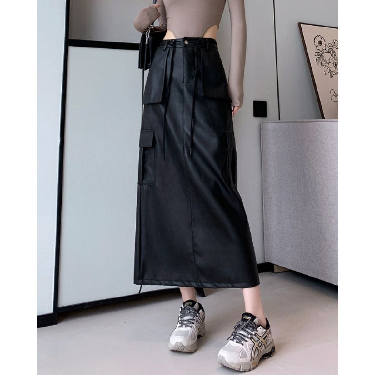 スカート タイトスカート ロングスカート フェイクレザー カーゴ レディース 合皮 韓国ファッション
