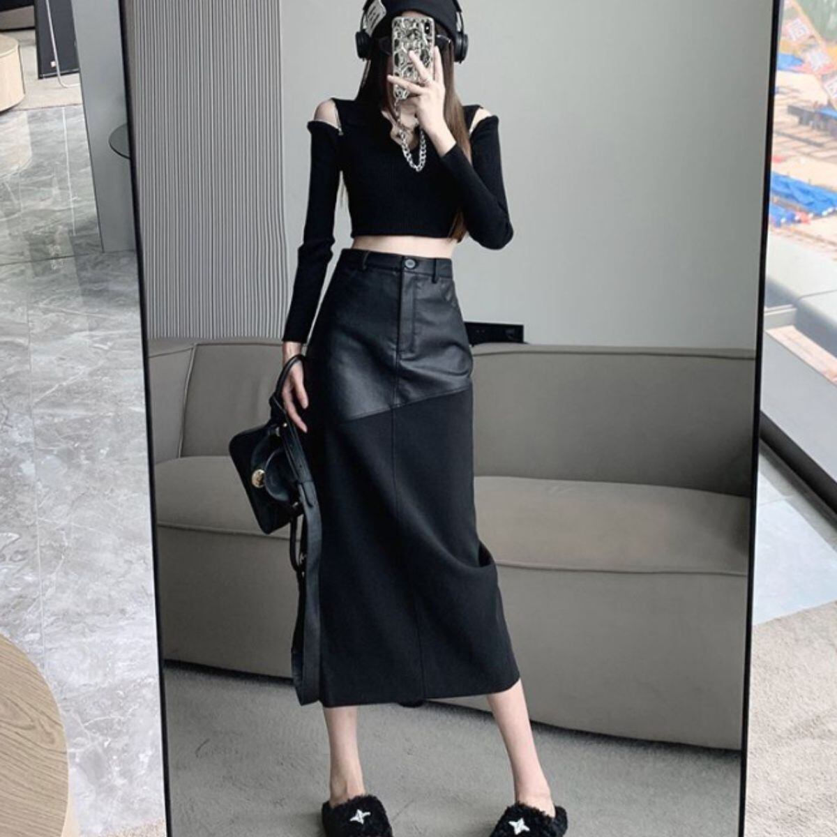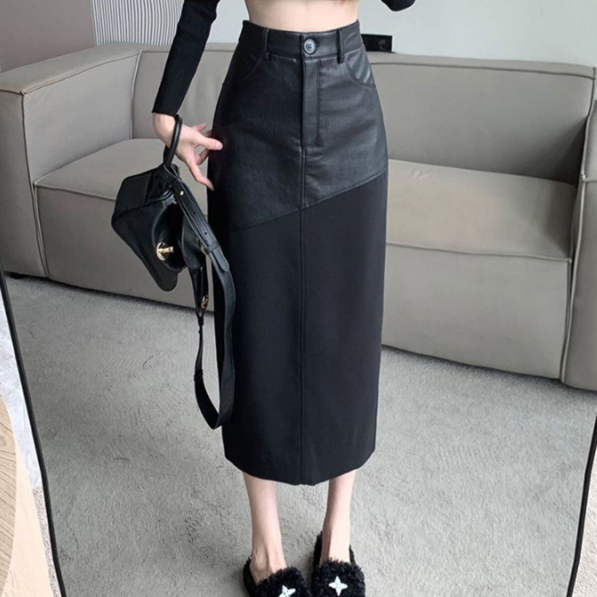 スカート タイトスカート フェイクレザー 合皮 ロングスカート レディース 韓国ファッション 異素材
