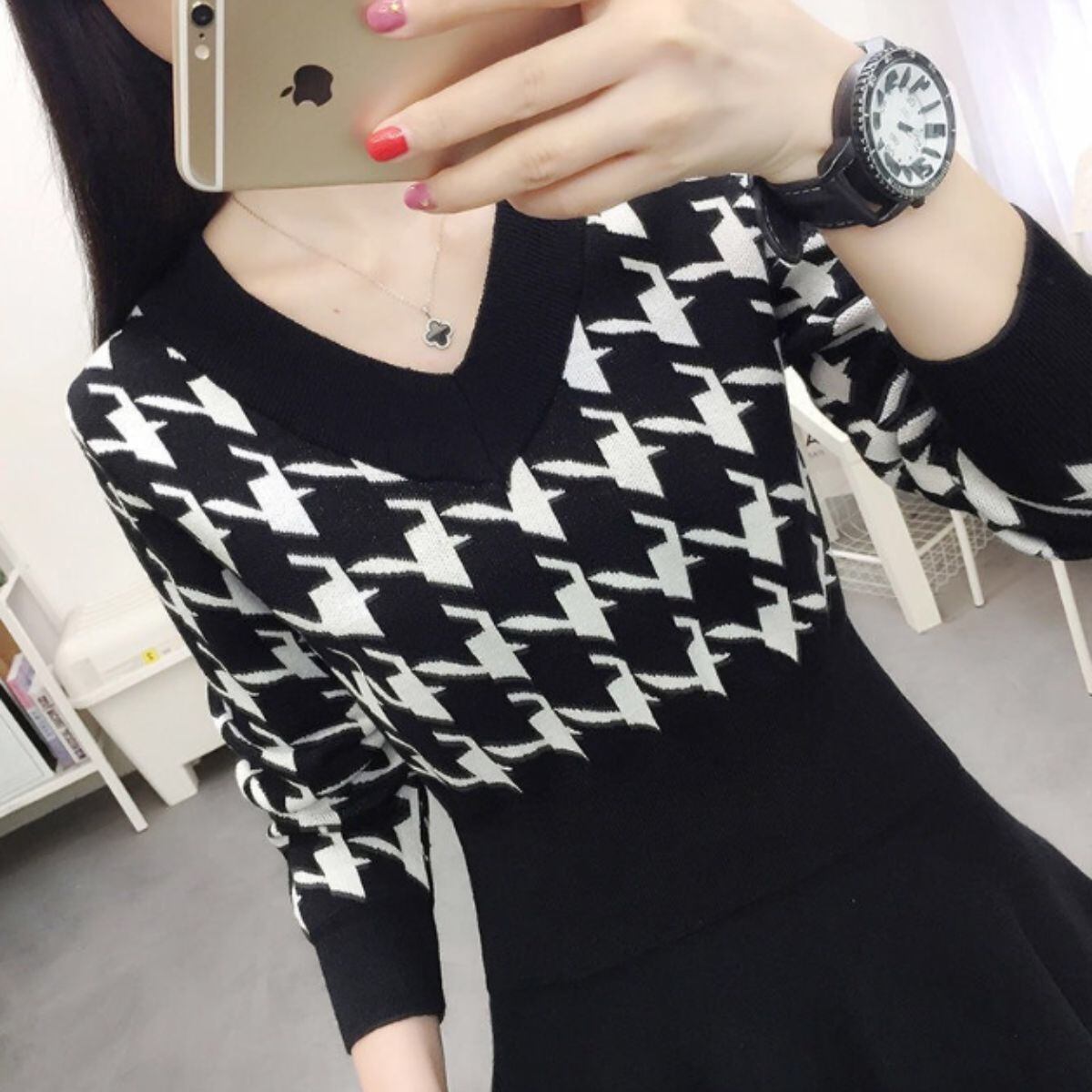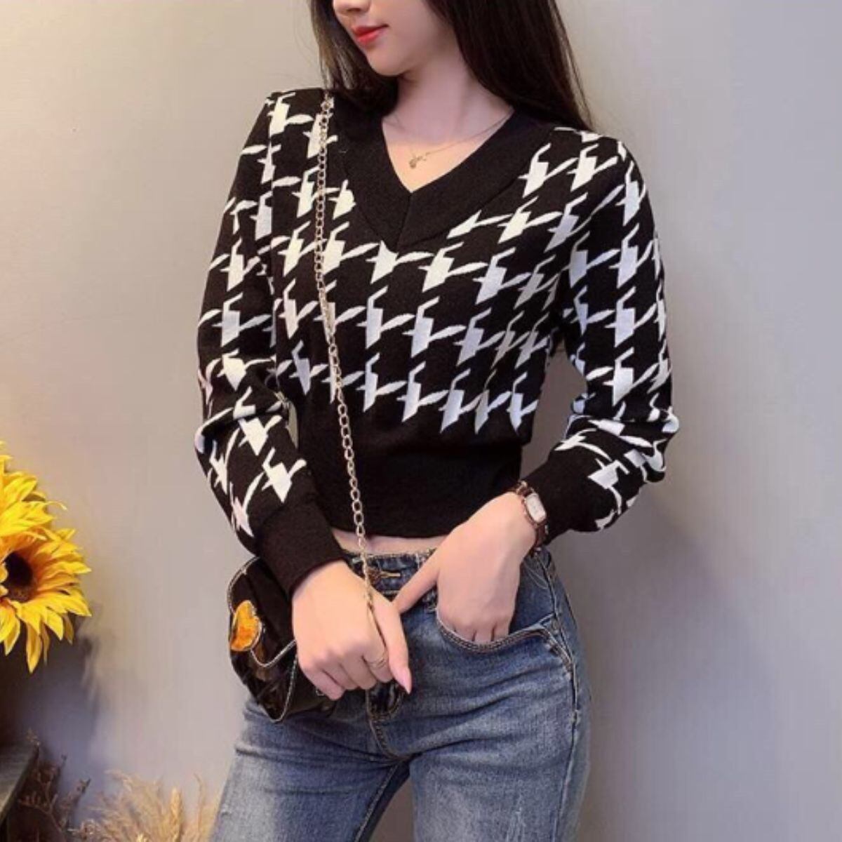 ニット セーター 長袖 ショート丈 Vネック ぴったり レディース 千鳥 総柄 韓国ファッション チ