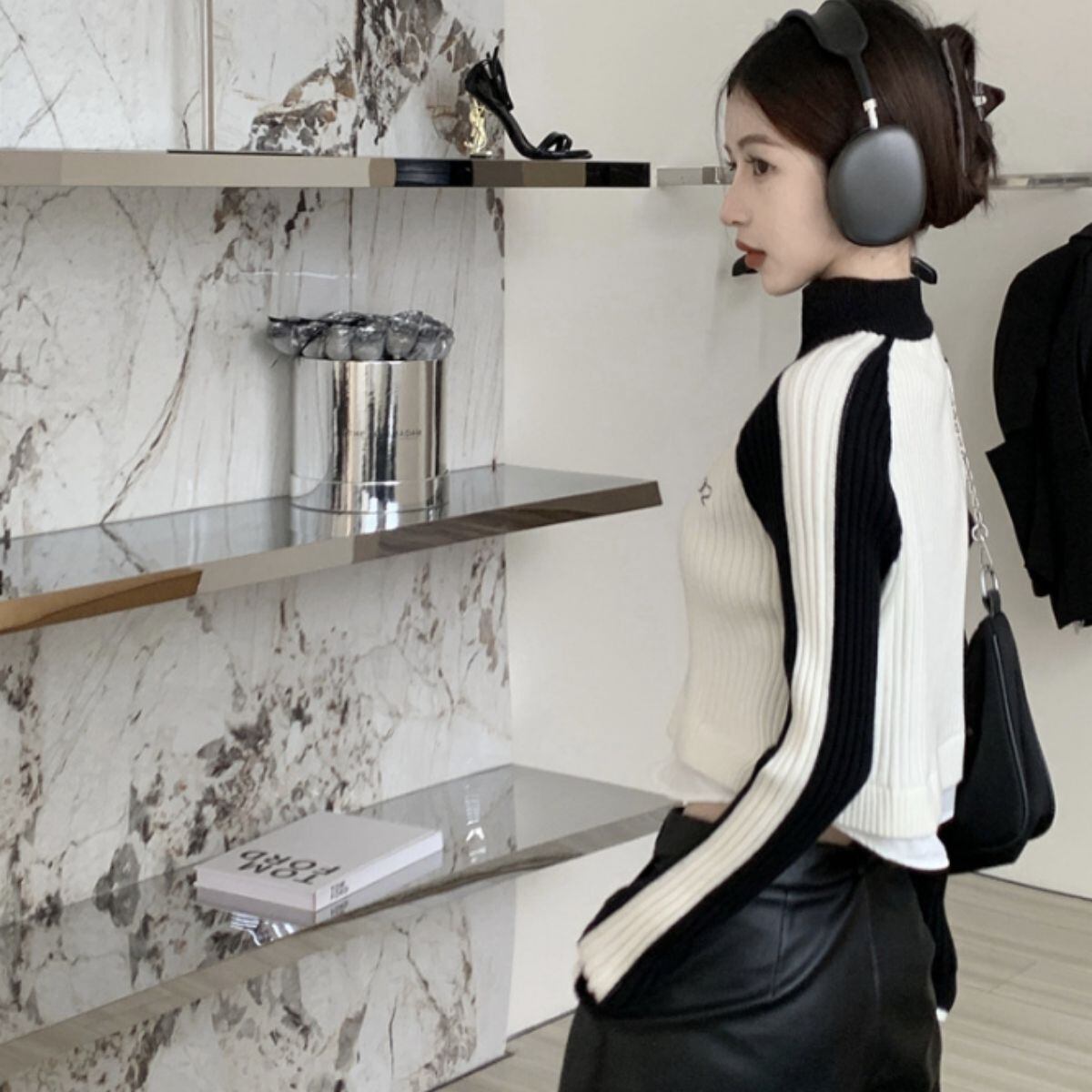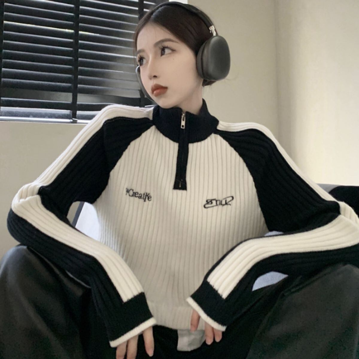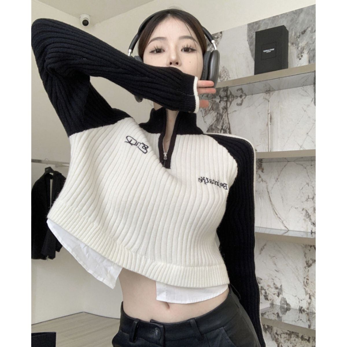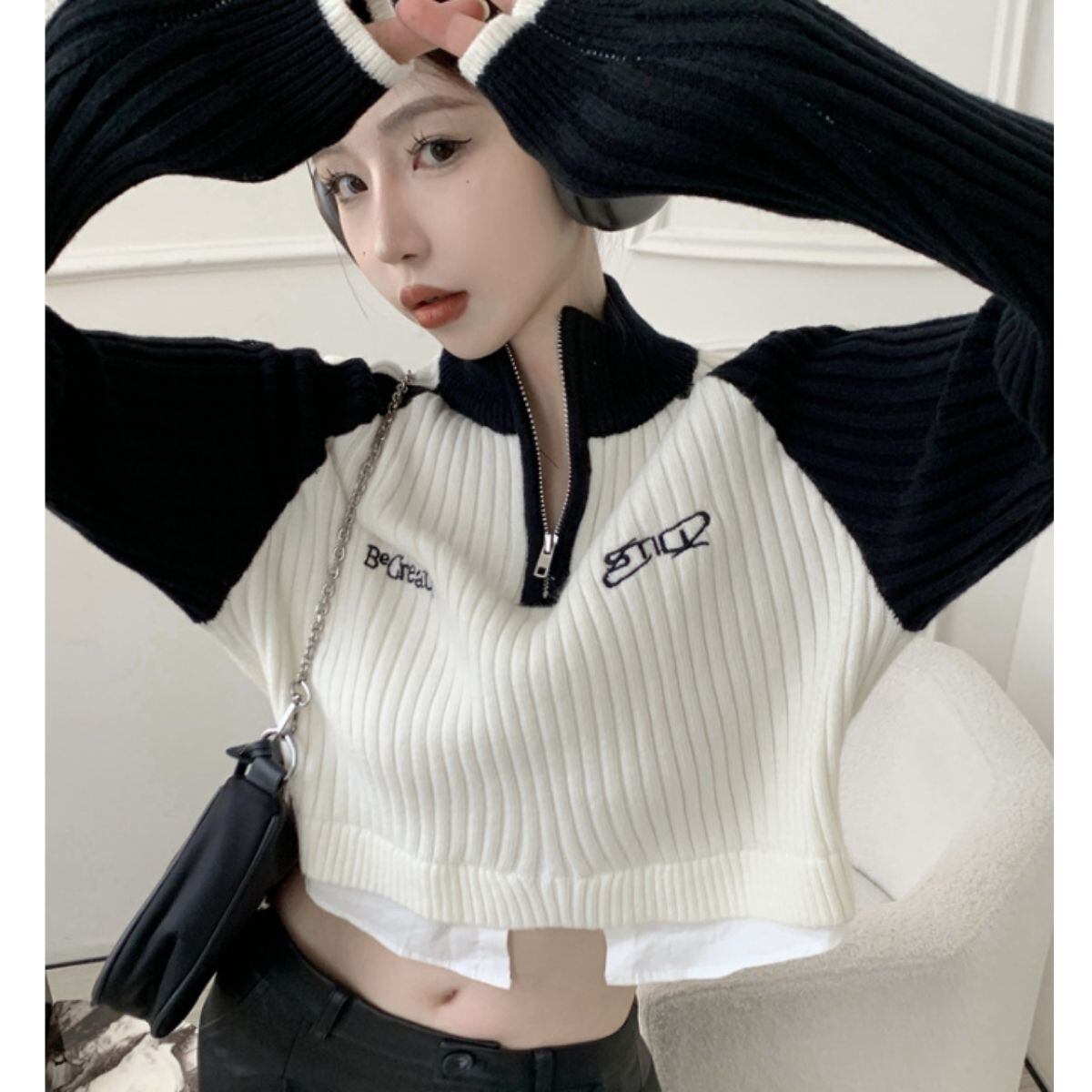 ニット リブニット 長袖 ハーフジップ スタンドカラー バイカラー レディース 韓国ファッション ス