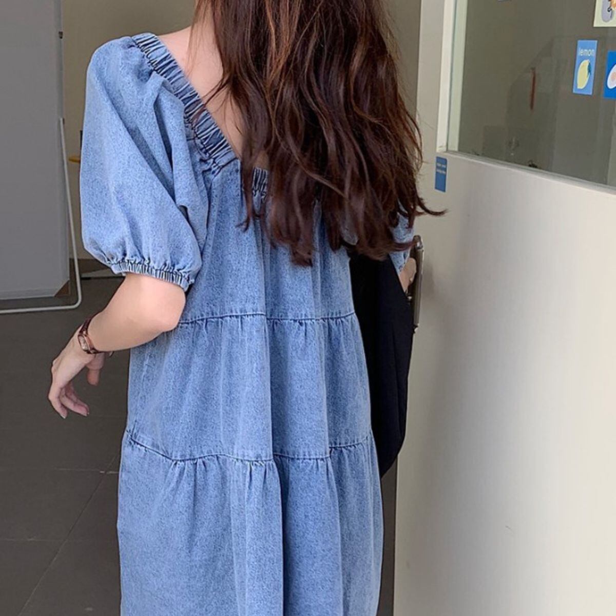 デニム ワンピース 半袖 ミニ フリル フレア スカート ティアード サーキュラー かわいい レディ