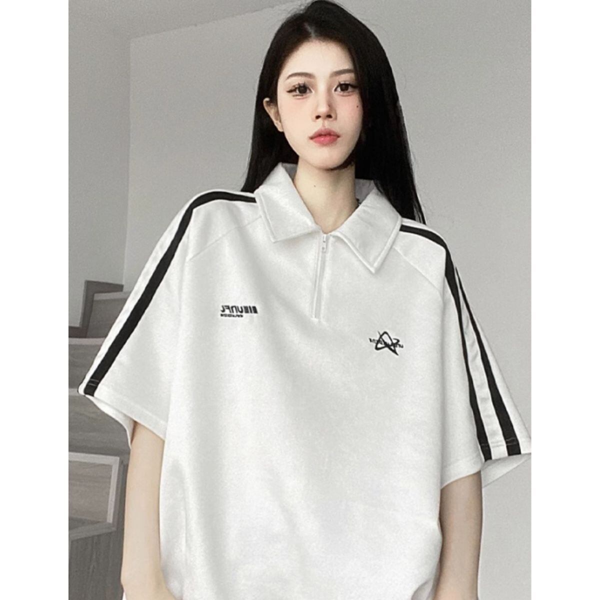 ハーフジップ Tシャツ 半袖 スポーティ ストリート ライン レディース 春夏 韓国ファッション シ