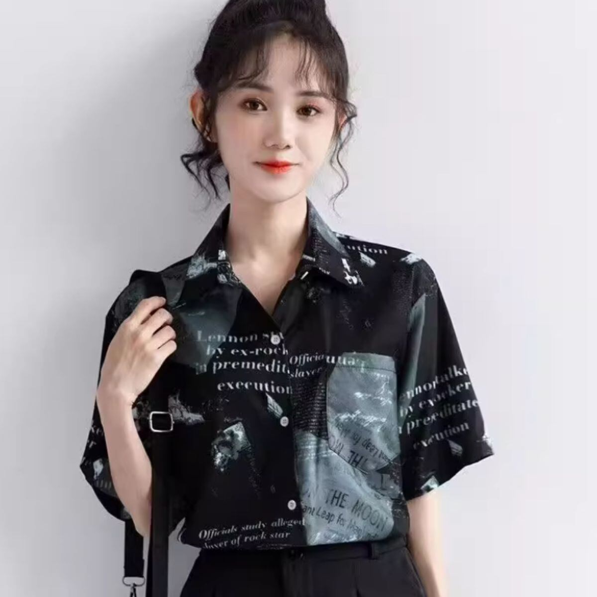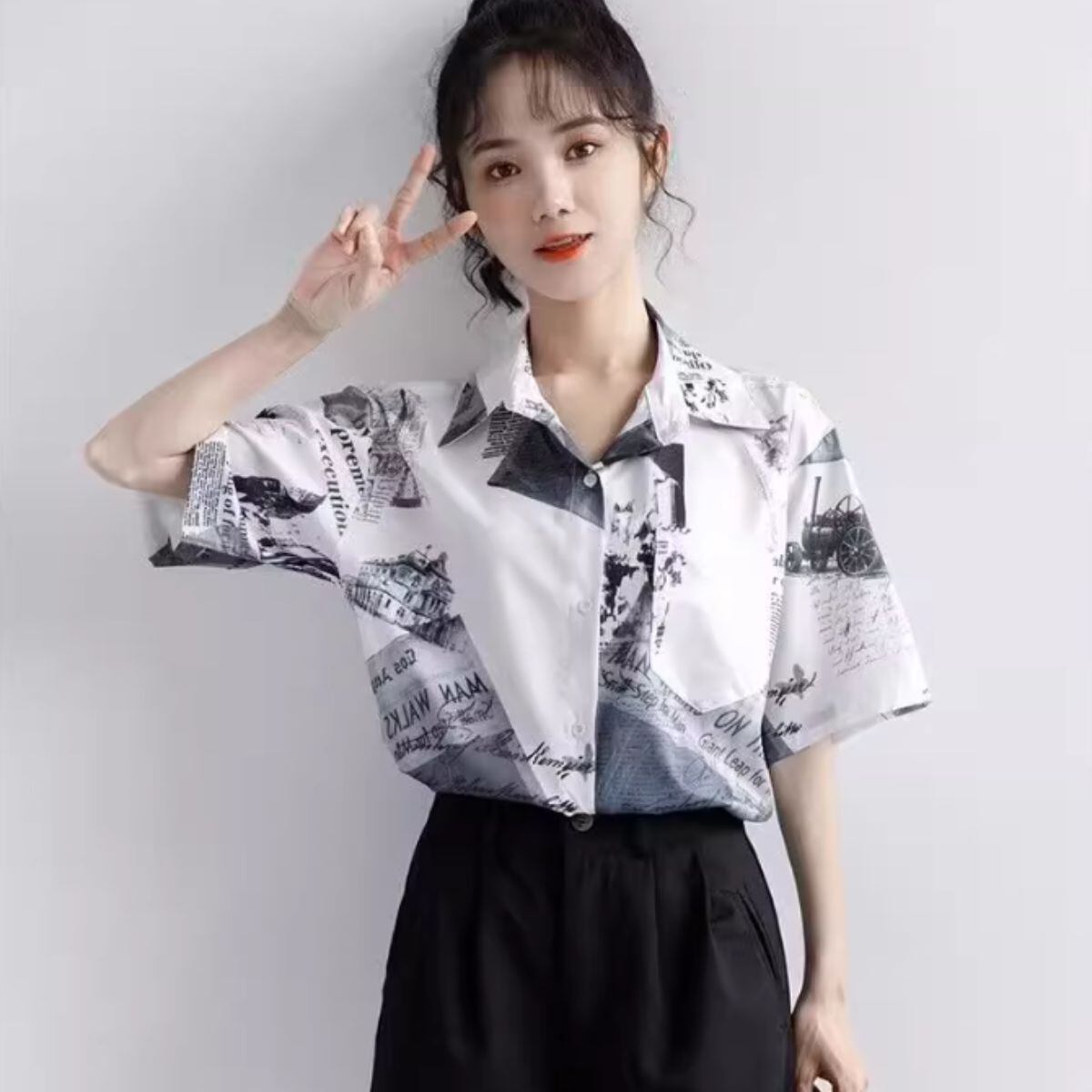 シャツ レディース 柄シャツ 半袖 半袖シャツ ブラウス 韓国ファッション トップス 英字 夏服 襟