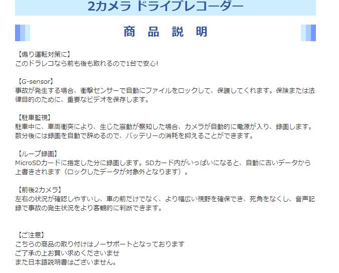 2カメラ ドライブレコーダー ドラレコ 前後カメラ HD1080P 4インチ 170度広角 Gセンサー搭載 車載カメラ