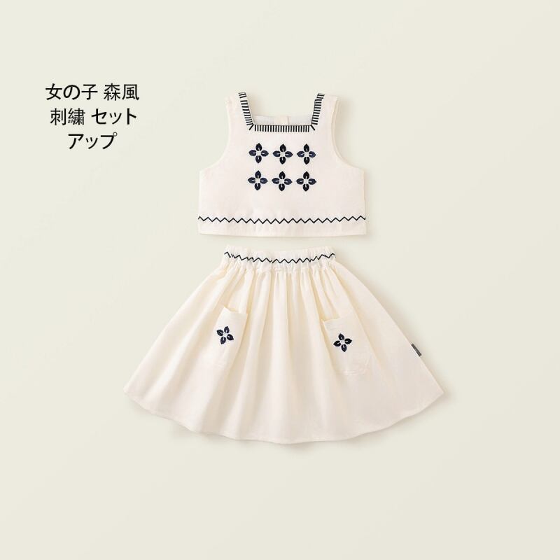 【2025夏】女の子 森風 刺繍 セットアップ 韓国風 タンクトップ スカート 2点セット 90-140cm おしゃれ