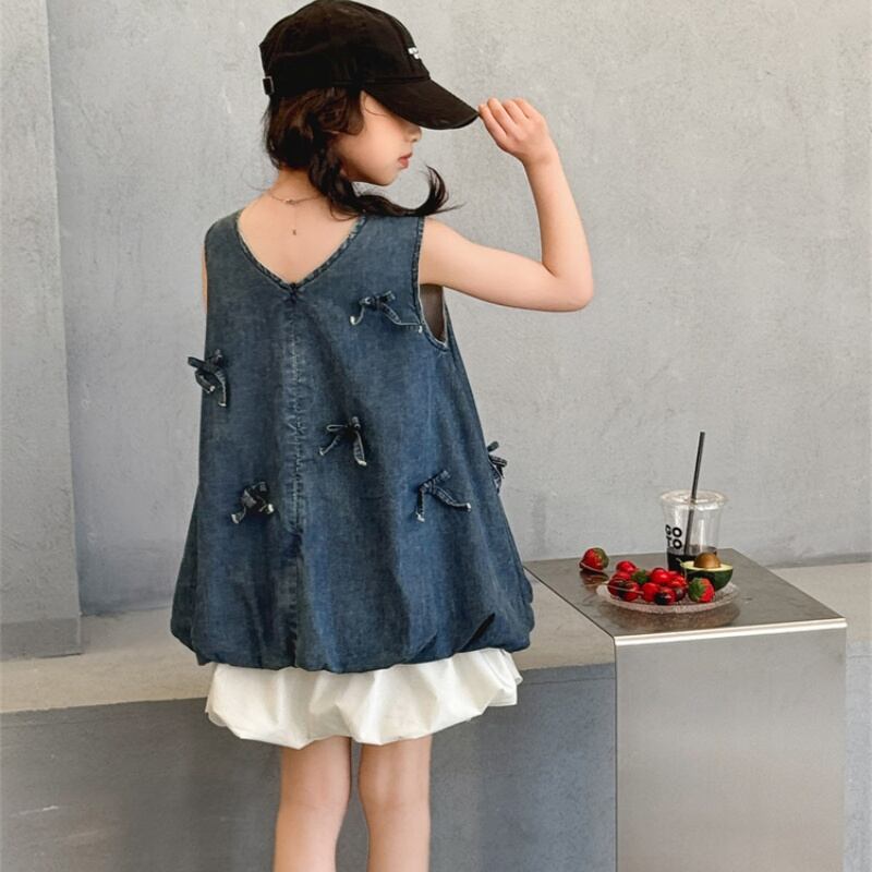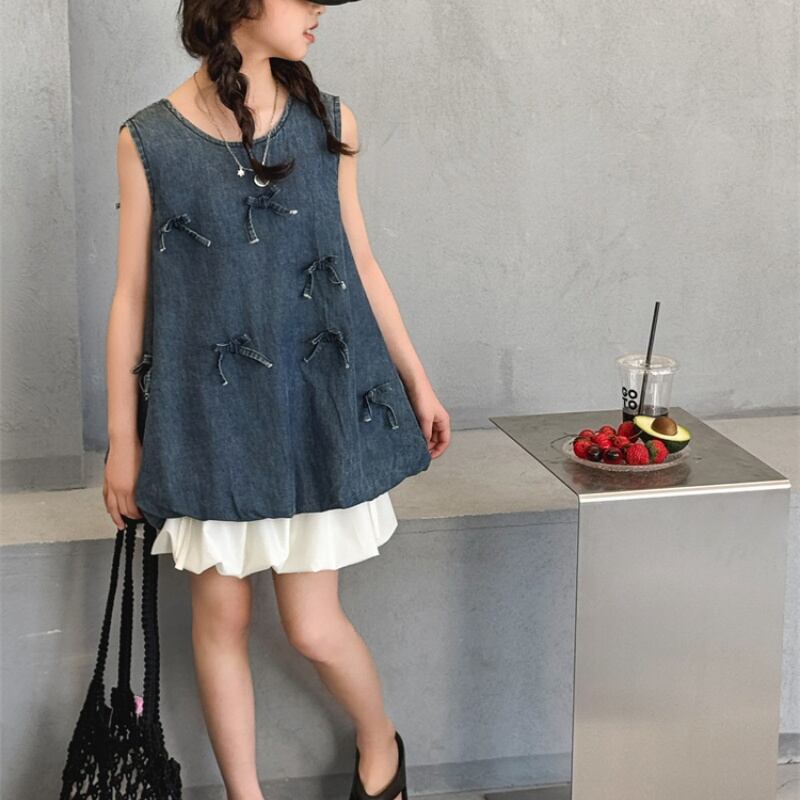 女児用 超薄デニム リボン付き花苞スカートワンピース2025年新作