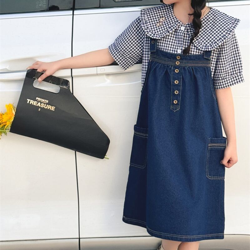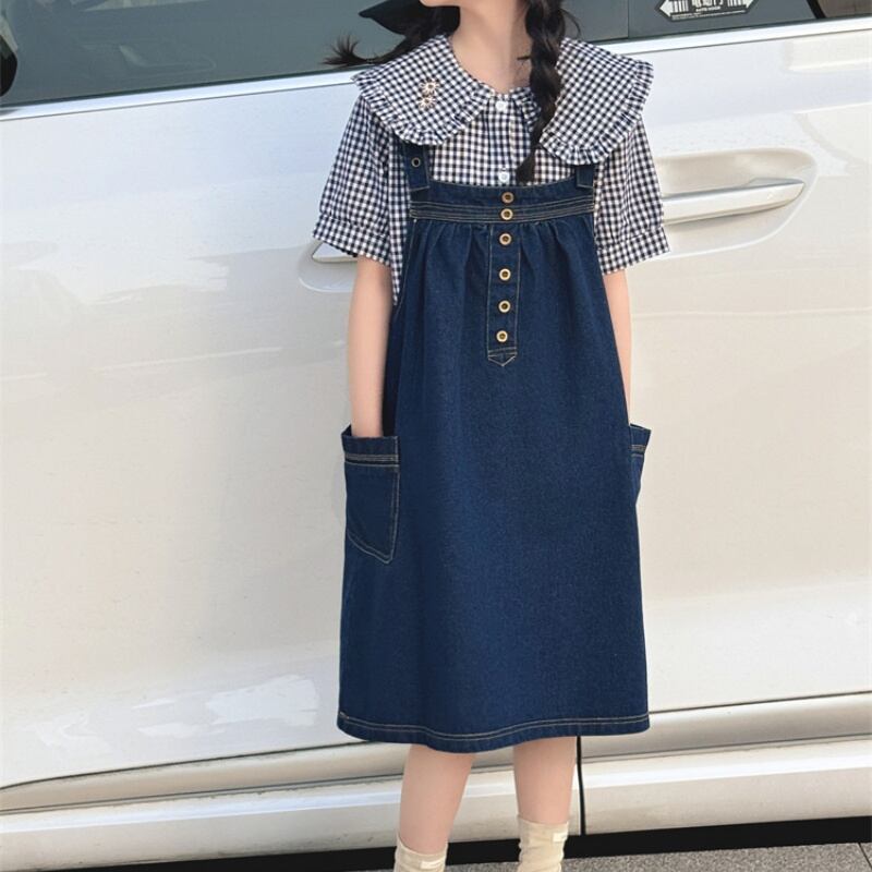 刺繍入りチェックシャツ&デニムサロペットセット 2025年夏 新作 女児用