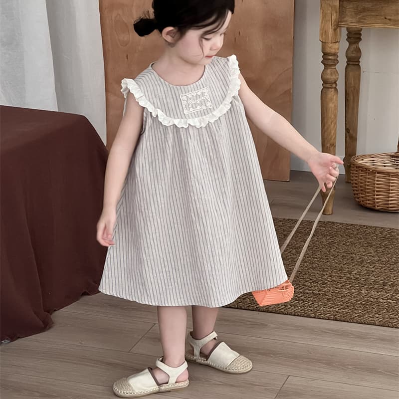 【2025夏新作】韓国風 女の子ワンピース レース付きストライプ ノースリーブ