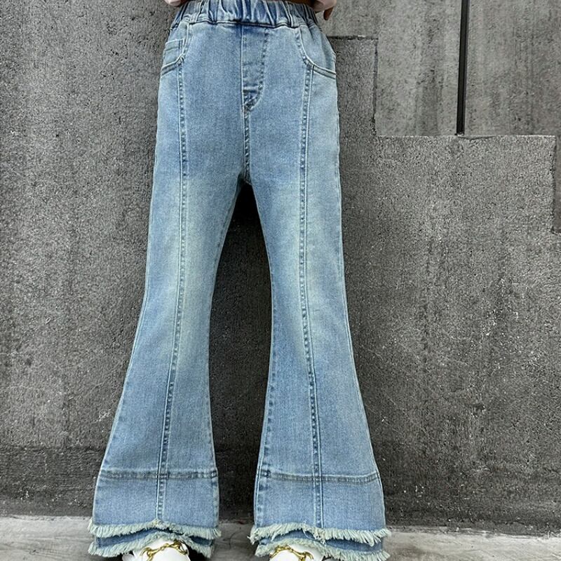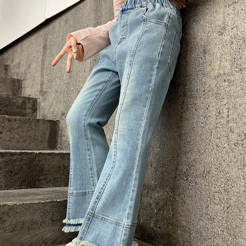 女の子用ダブルフリンジベルボトムロングデニムパンツ(春・秋向け)