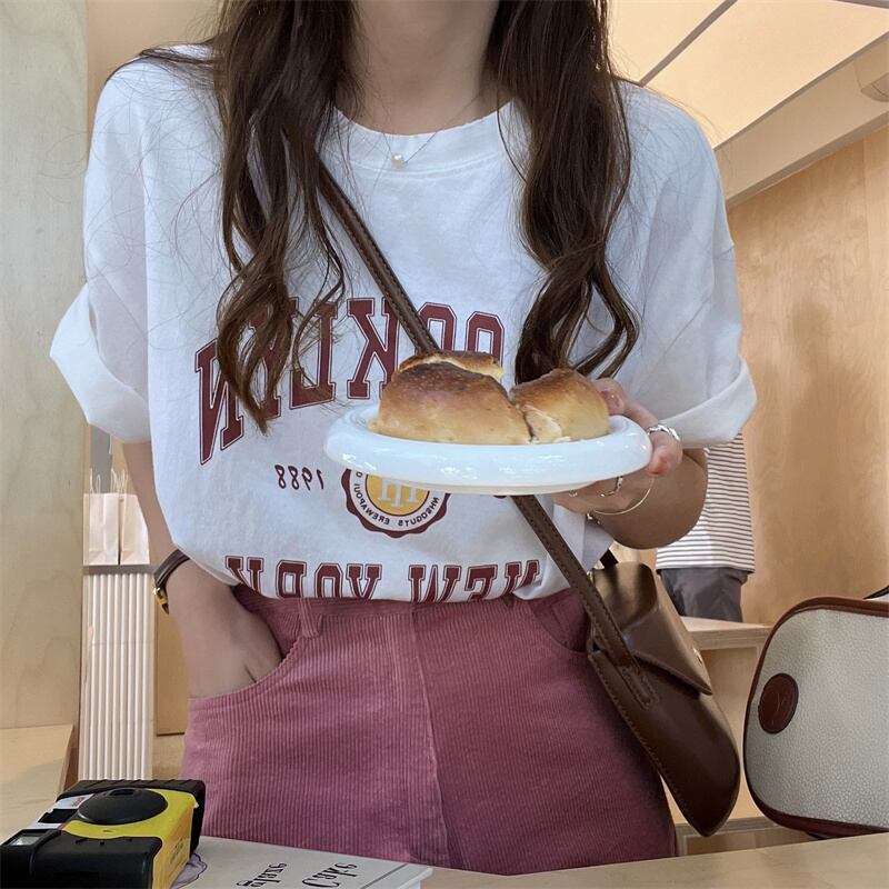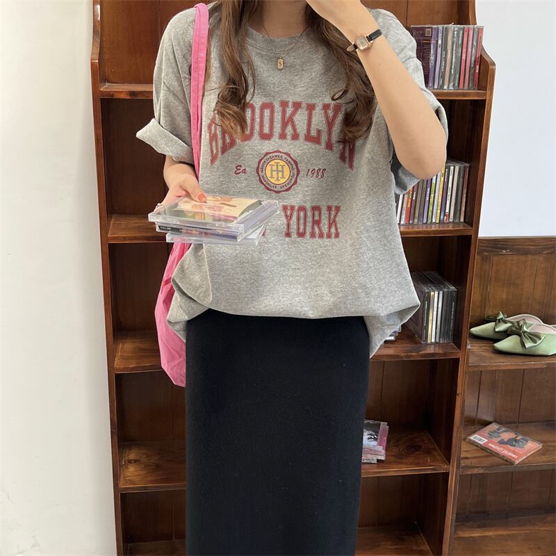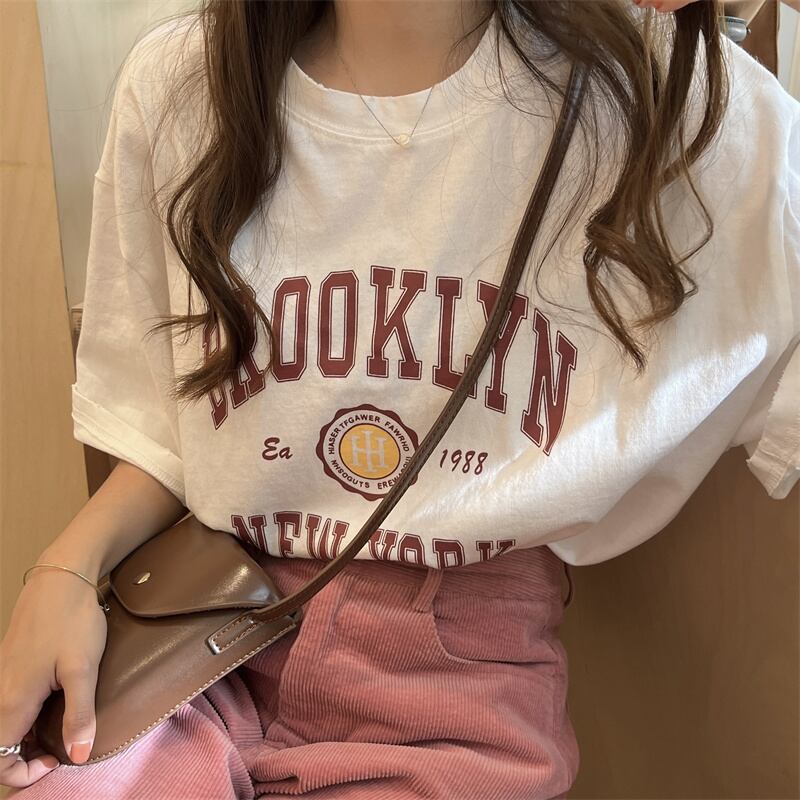 初回送料無料トップス半袖ルーズプリントラウンドネックレターレディースファション服