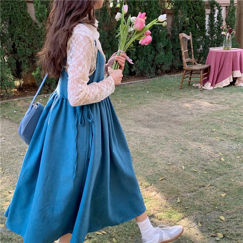 初回送料無料Vネックレースサスペンダーロングスカートボトミングシャツ