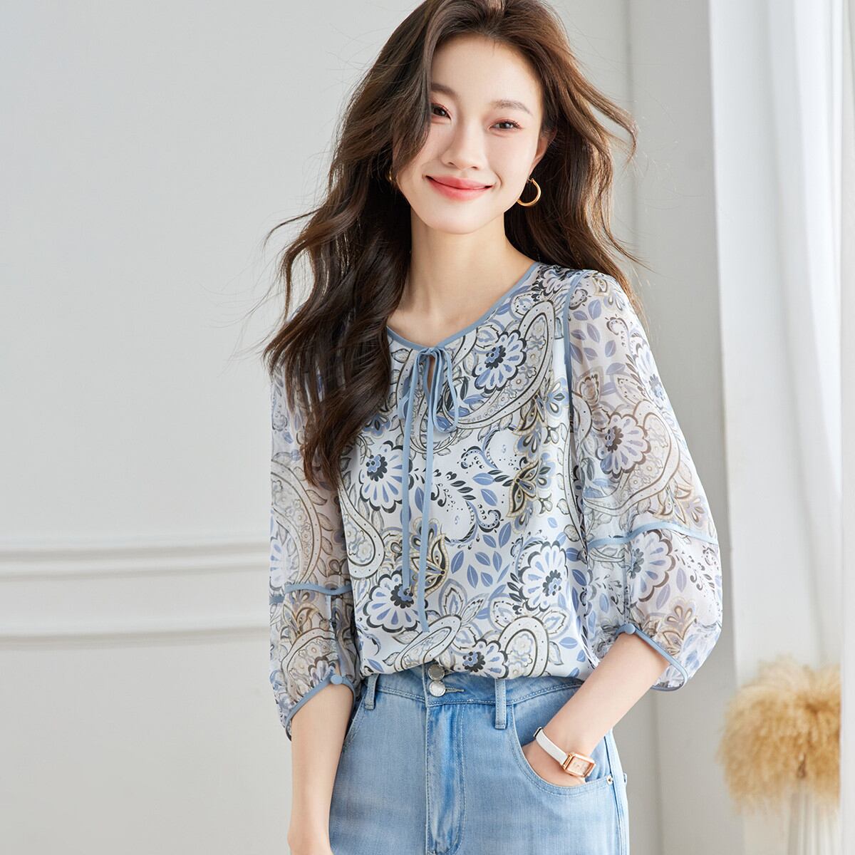 初回送料無料 夏レディースファッション カジュアル シフォン プリント ブラウス トップス
