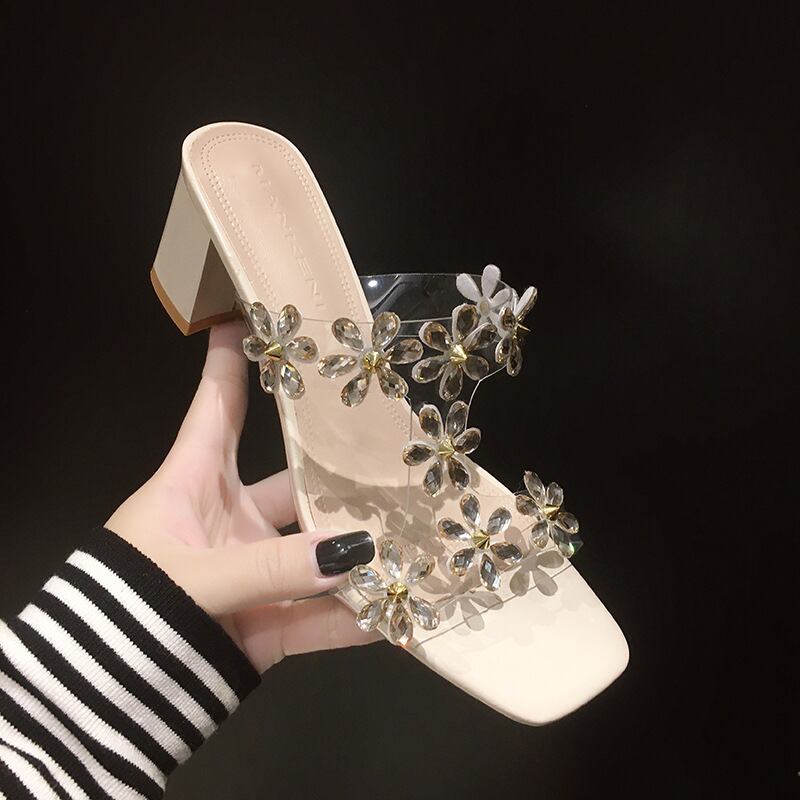 初回送料無料スリッパラインストーンチャンキーヒールオープントゥレディースサンダル