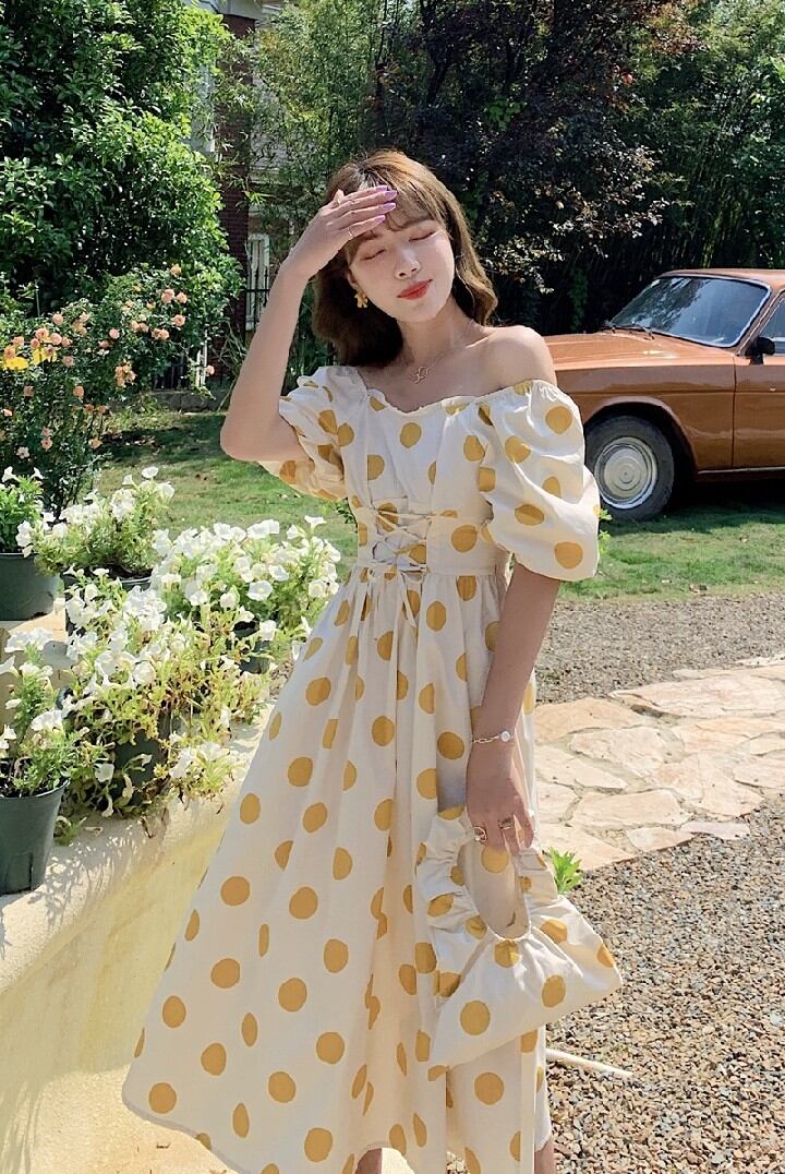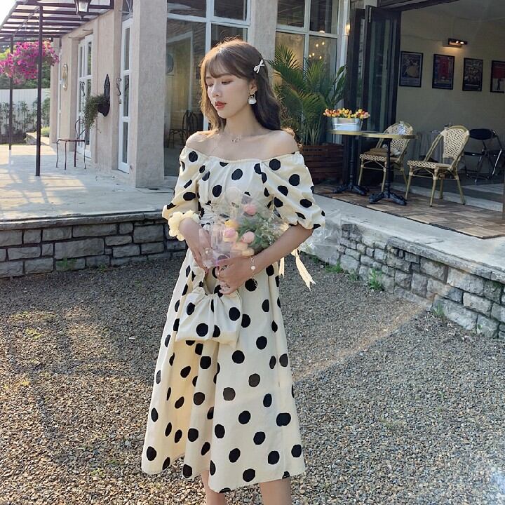 初回送料無料バック付き半袖ワンピースフラットネック水玉ロングワンピース