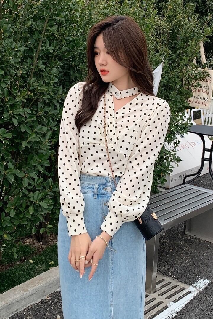 初回送料無料Vネックスリミング水玉ハンギングネックトップスレディースファション