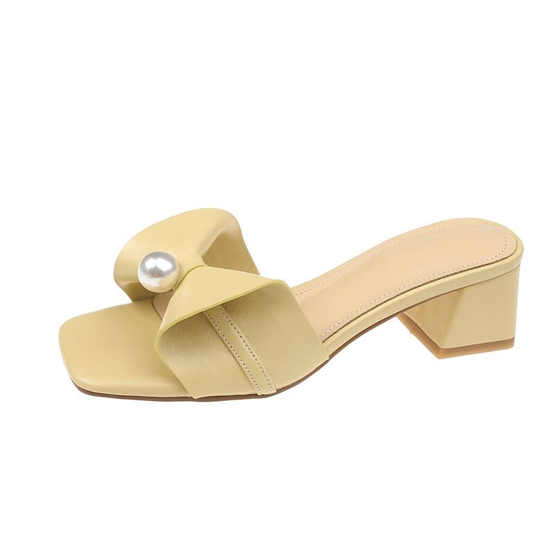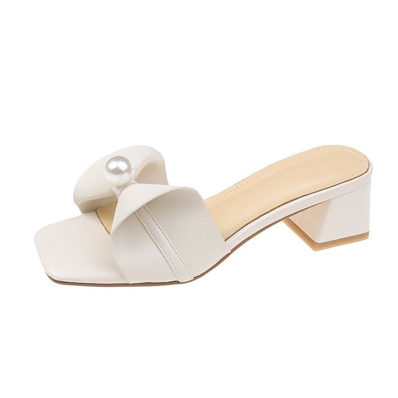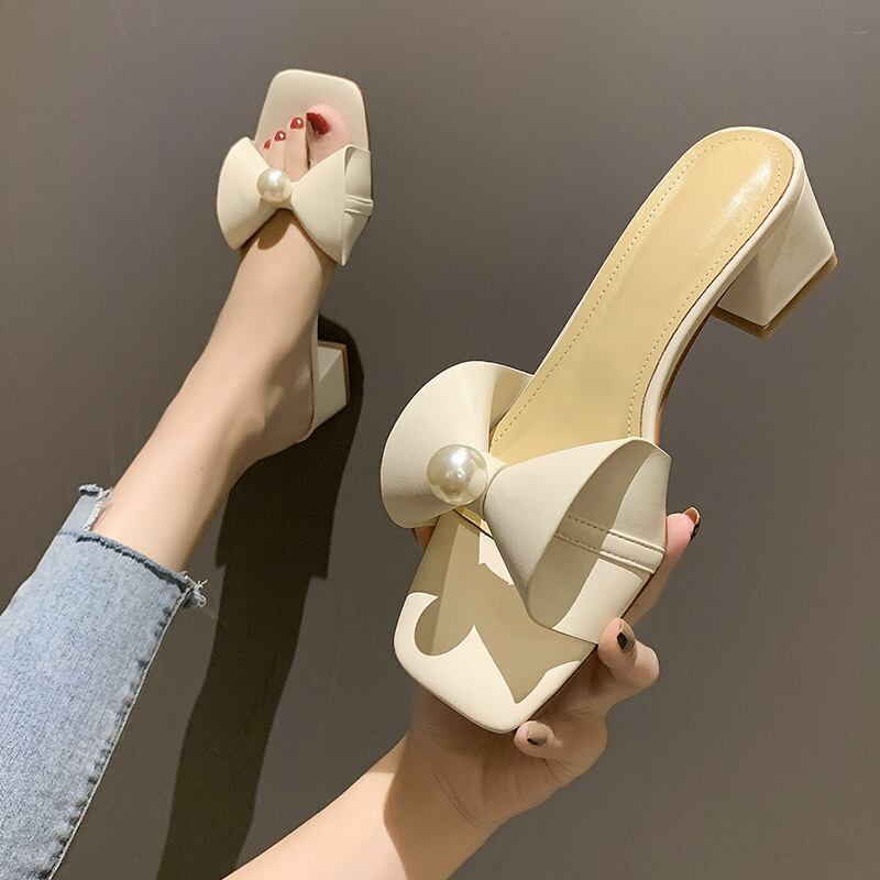 初回送料無料スリッパチャンキーヒールボウスクエアトゥレディースシューズ