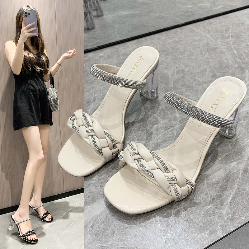 初回送料無料レディーススリッパチャンキーヒールスクエアトゥスリップオン