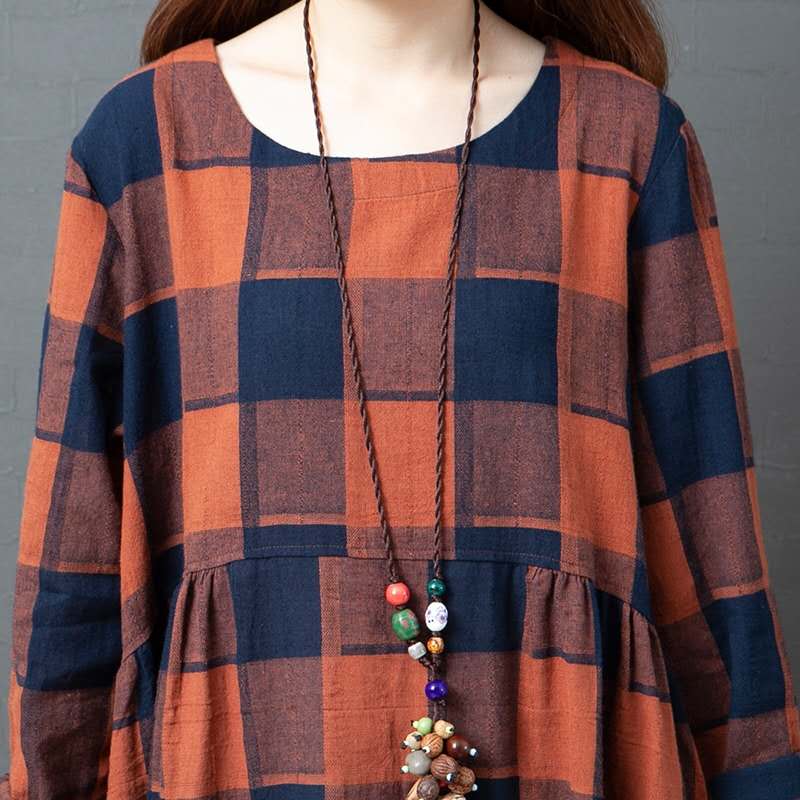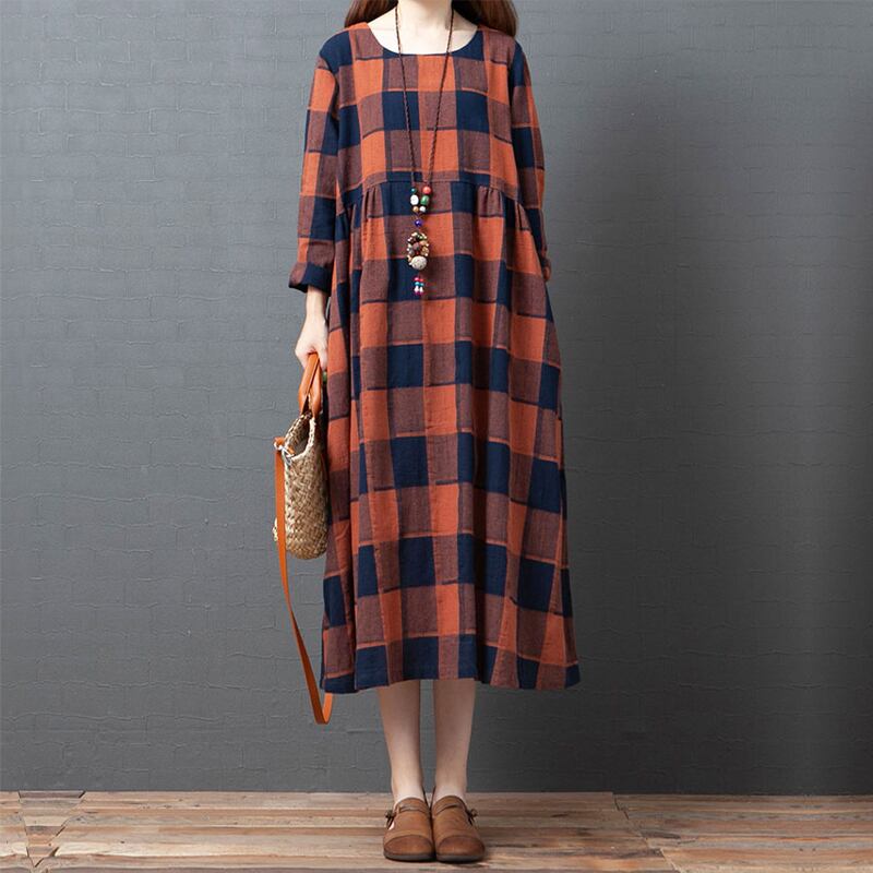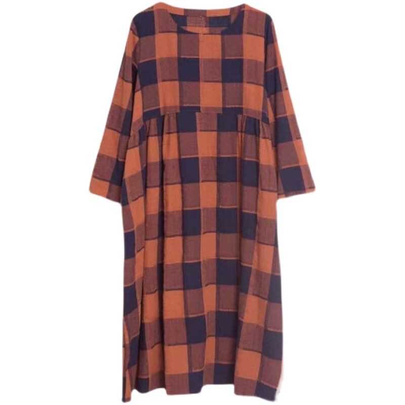 初回送料無料プラスサイズロングコットンリネンワンピースチェック柄