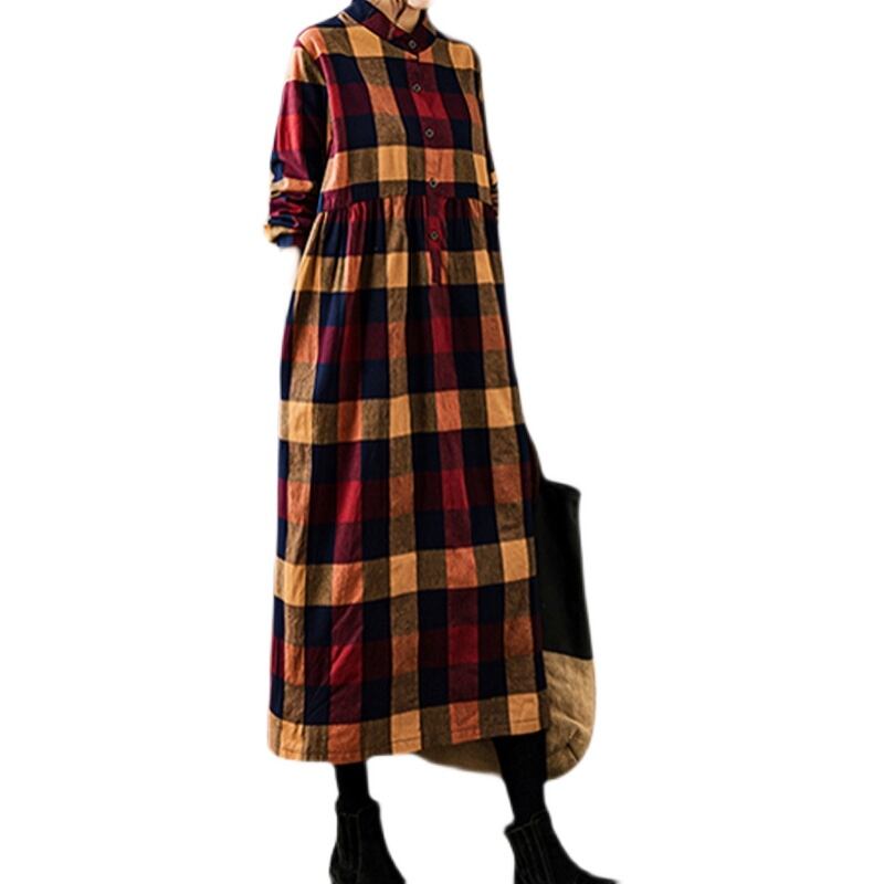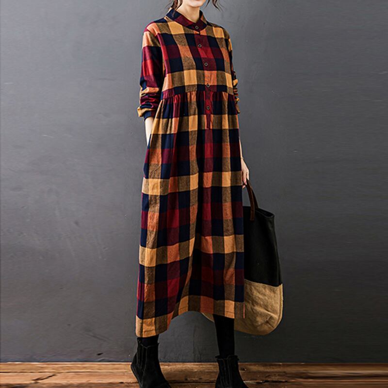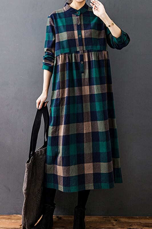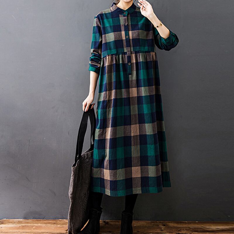 初回送料無料プラスサイズのコットンリネンドレスチェック柄ワンピース