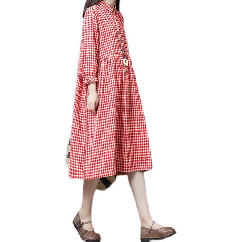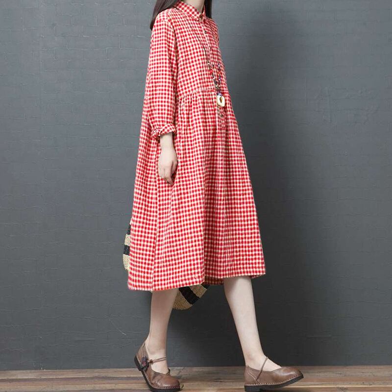 初回送料無料プラスサイズのルーズコットンリネンドレスチェック柄ワンピース