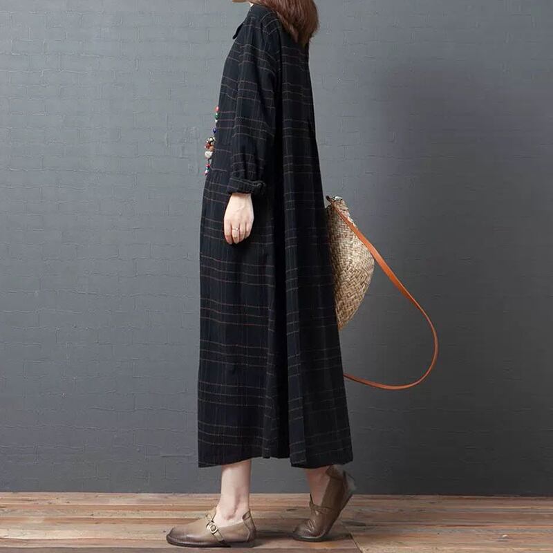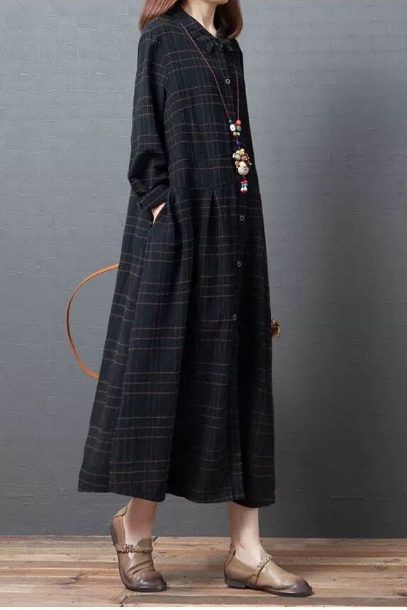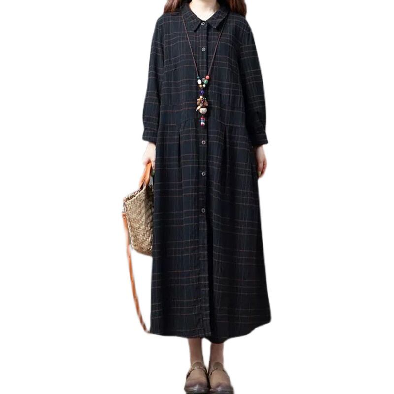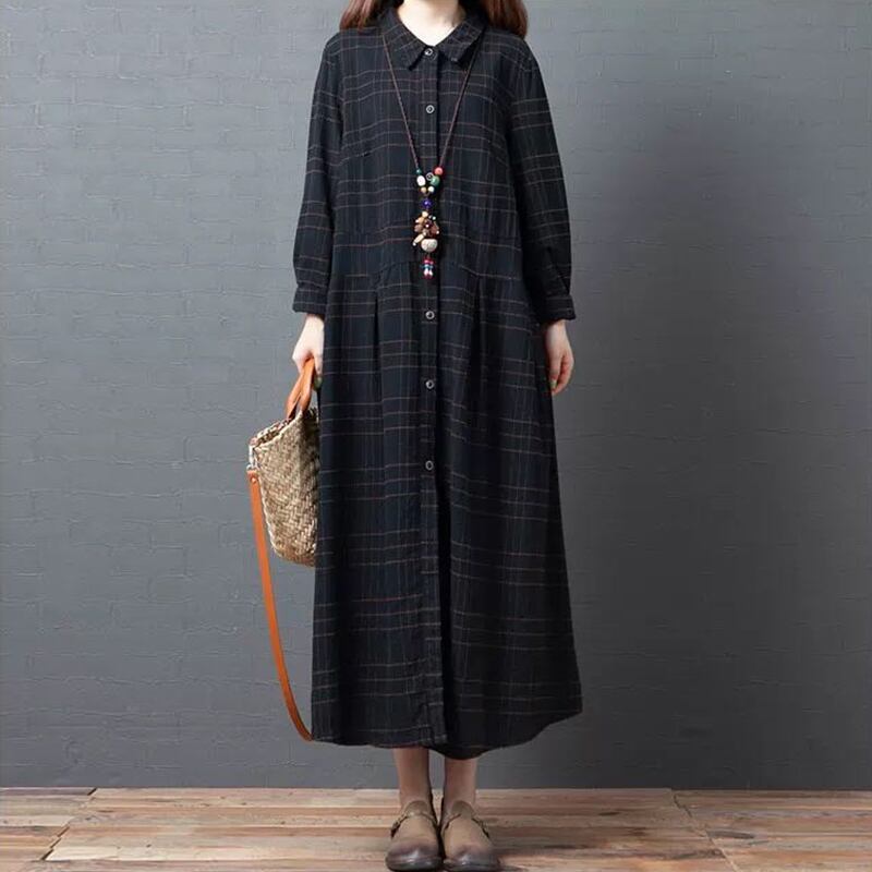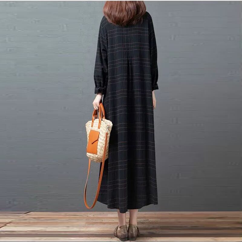 初回送料無料プラスサイズのルーズコットンリネンドレスチェック柄ワンピース