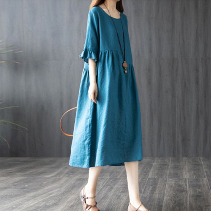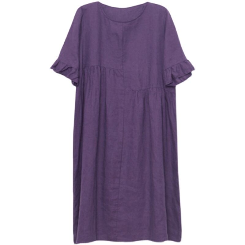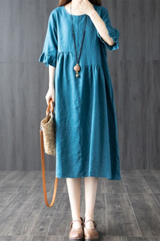 初回送料無料ゆったりとしたコットンリネンワンピースラウンドネック