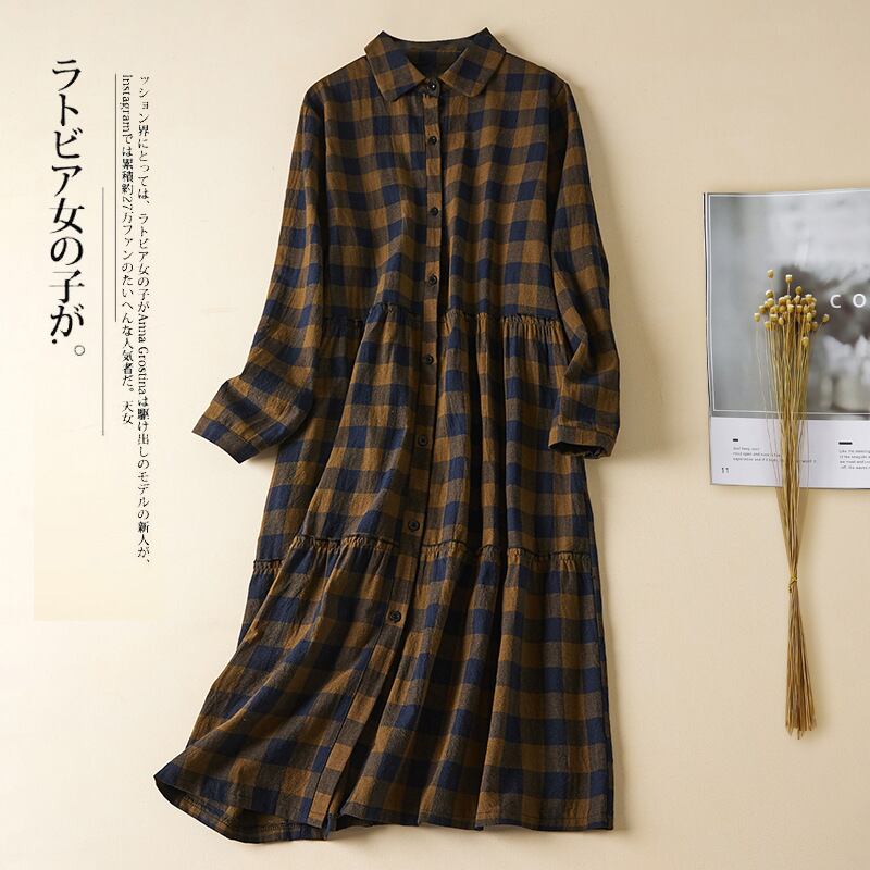 初回送料無料 ゆったり綿麻の大きいサイズのチェックワンピース カジュアルワンピース 人気商品