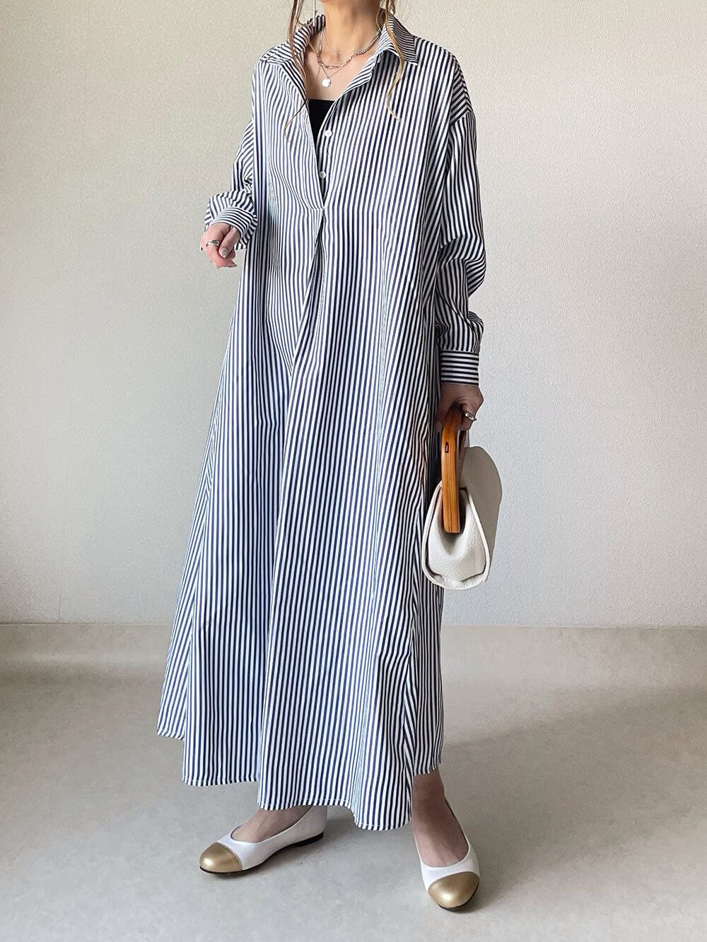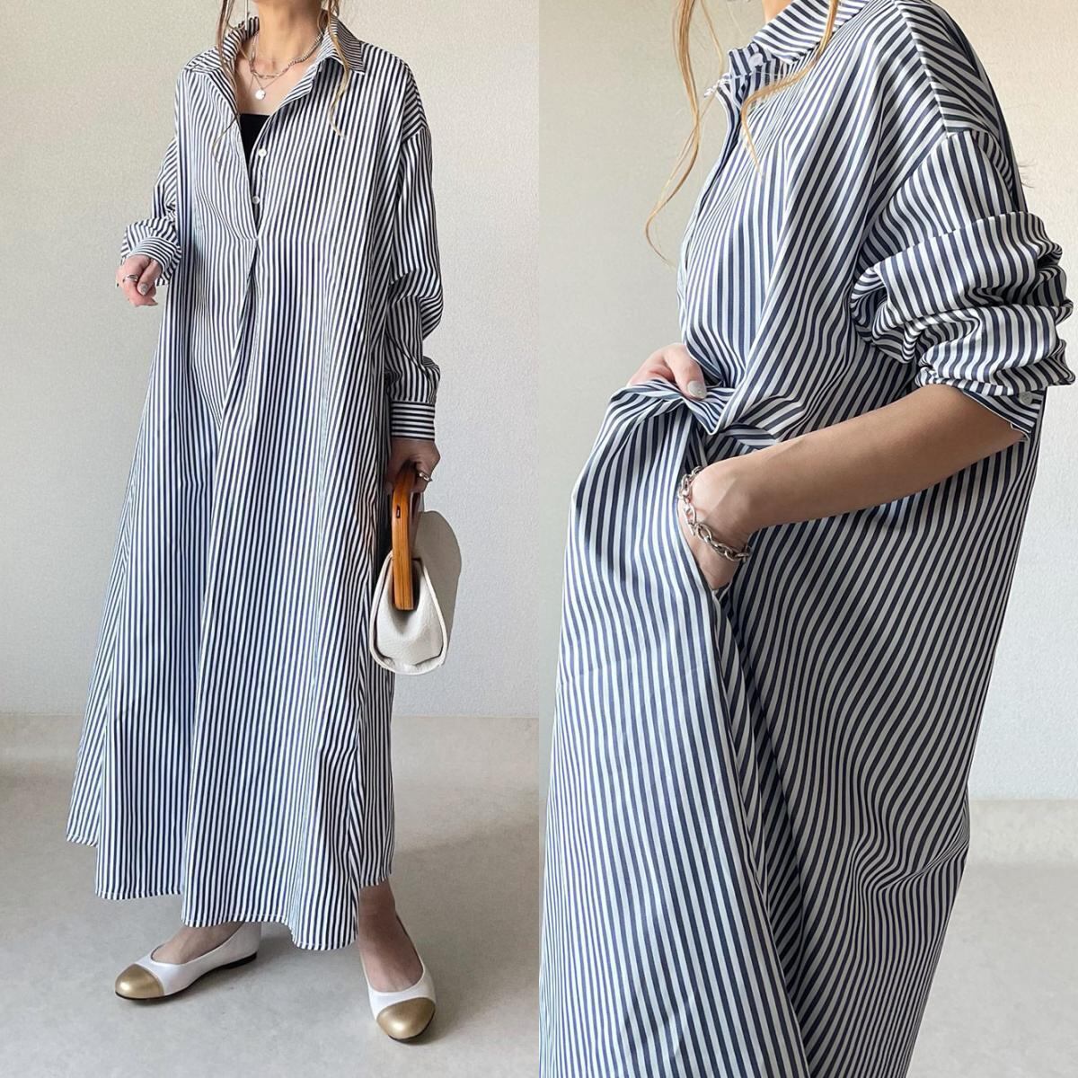初回送料無料春秋 新作日系長袖ゆったりストライプシャツ風ワンピース レーディスファション商品