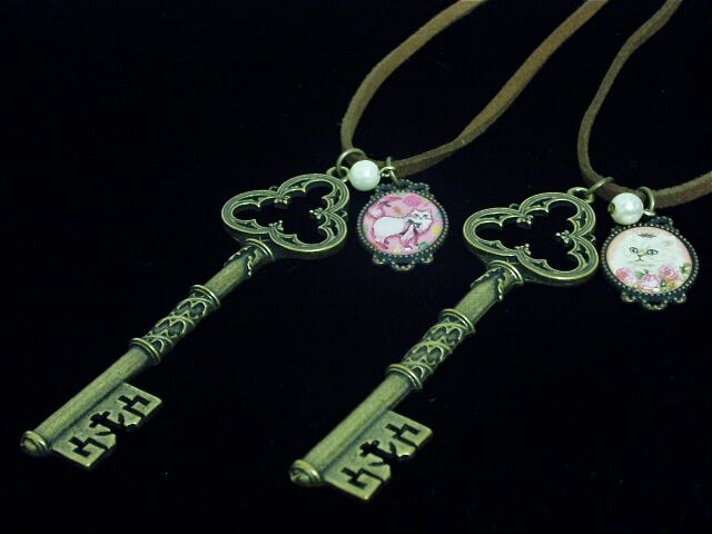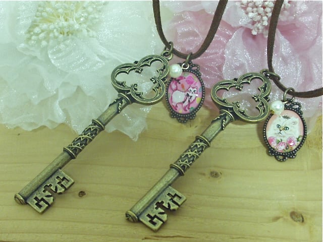 ロングチョーカー・鍵モチーフとアンティーク調パーツの猫ちゃん