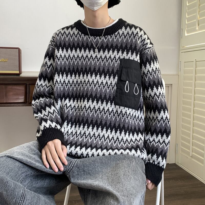 メンズ・プリントニット・セーター・コート・気質・長袖・アウター・M-2XL
