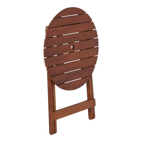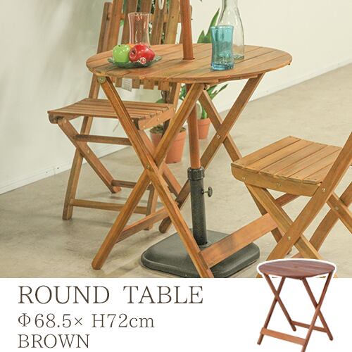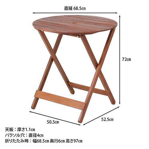 天然木を使用したあたたかみのあるガーデンテーブルです。お庭はもちろん、ベランダやバルコニーのスペースでもご使用いただけます。天板にはパラソル用の穴が空いており、パラソルと一緒に使用可能です。折りたたむことができるんで、使用時以外は省スペースに収納できます。