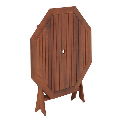 天然木を使用したあたたかみのあるガーデンテーブルです。お庭はもちろん、ベランダやバルコニーのスペースでもご使用いただけます。天板にはパラソル用の穴が空いており、パラソルと一緒に使用可能です。折りたたむことができるので、使用時以外は省スペースに収納できます。