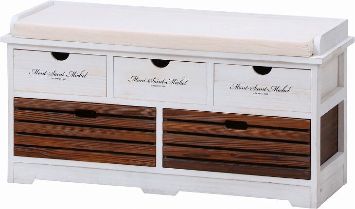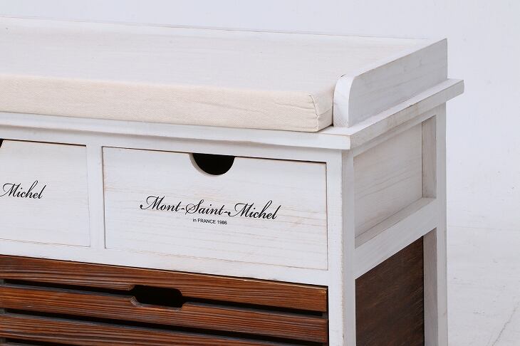 ホワイトウォッシュ加工でレトロ・アンティークな風合いに仕上げた収納付きベンチです。なんでも入れられる収納力抜群の引き出しが5杯もついているのでお部屋の整理にもピッタリ!完成品なので面倒な組み立ても必要ありません!■完成品■収納家具■チェア