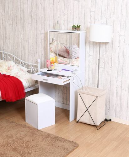 LEDライトがついた三面鏡のシンプルなデザインのドレッサーです。ミラー裏には高さ調節できる棚板収納スペースがあり、幅広い引き出し収納もついているので、多くの小物を整理しておくことができます。メイクやヘアセットなど身だしなみを整えやすいように、ミラーの角度を動かしてお好みで調整することができます。LEDをつけて使用することで、メイクの細かい発色もよく見えます。2つのコンセントもついている為、ヘアアイロンなどを使ってヘアセットできます。