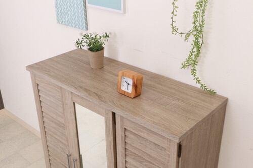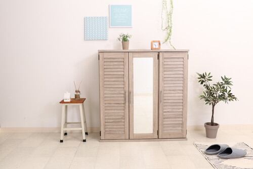 玄関の収納にピッタリのシューズボックスです。通気性が良く、においがこもりにくいルーバー扉仕様です。またミラー付きなので、身だしなみのチェックもできます。