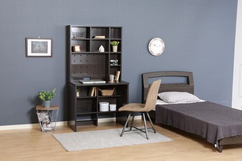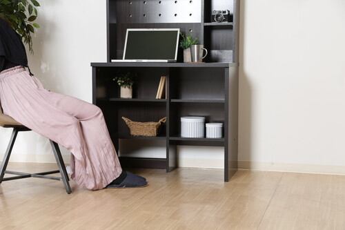 上棚には使い勝手の良い可動棚を使用しており、背の高い本もしっかりと収納できます。また、デスク脚元にもスペースを有効活用できる収納付きです。使用頻度の少ない辞書などをまとめて収納できるので、机周りをスッキリ整頓させられます。