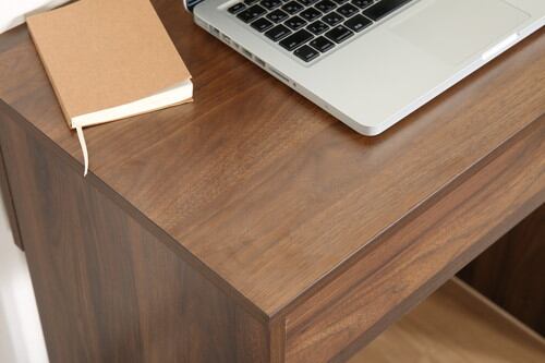 工具は一切使わず、パーツを組み合わせるだけで簡単に組み立てできます。パーツには返しがついているので簡単に外れない仕様です。天板にはコード用の切り欠きつきなので、ぴったり壁付けしても、ケーブルをスムーズにつなぐこともできます。また、引き出し付きで筆記用具などの収納に便利です。脚部には高さを微調整できるアジャスター付きです。