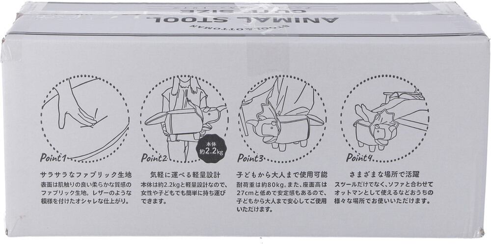 耐荷重は80kgで、ちょっとした腰掛けに使えます。2.2kgと軽く、子供でも持ち運ぶことができます。脚裏にはフェルトが貼ってあり、床の傷つきを防止します。このカラーパッケージを更に外箱に入れた二重梱包で、ギフトなどにも最適です。内箱サイズ:550×260×240mm