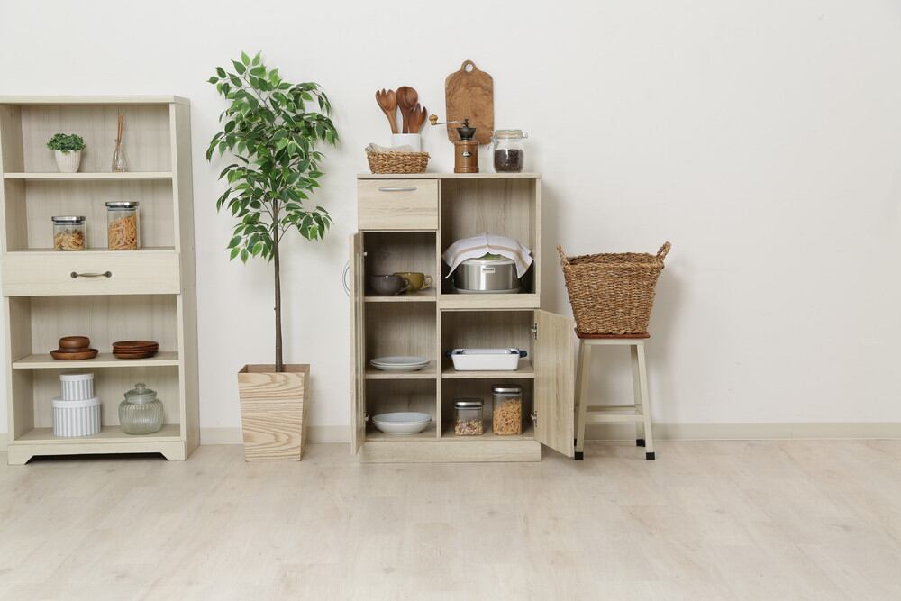 お好みの高さに合わせて、棚の付け替えができます。引き出して使えるスライド棚です。炊飯時やお湯を沸かす際に出して使うことで、蒸気による棚の劣化を防ぐことができます。幅60×奥行39.8cmの広々した天板スペースは作業台としても活躍します。炊飯器やトースターなどのコードを通す穴があり、配線もラクラクです。