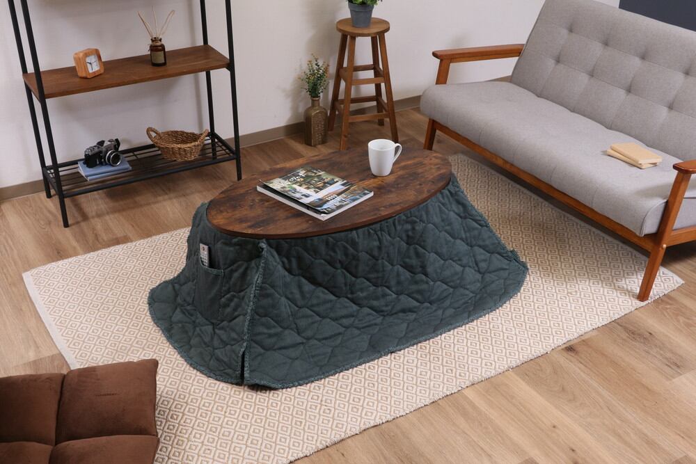 幅89×奥行49cmの場所を取らないコンパクトサイズです。1人で広々と、2人でも十分に使いやすいサイズ感です。専用のこたつ布団がセットになっています。ポケット付きなので、スマホやリモコンなど入れておくのにも便利です。まるで本物の天然木のような木の息遣いを感じられる天板で、空間に安心感をもたらします。布団を外せばセンターテーブルとしてオールシーズン使えます。