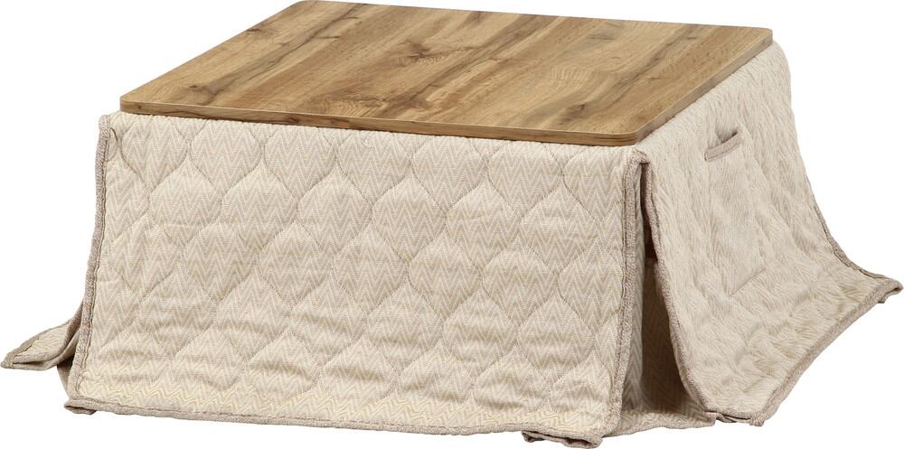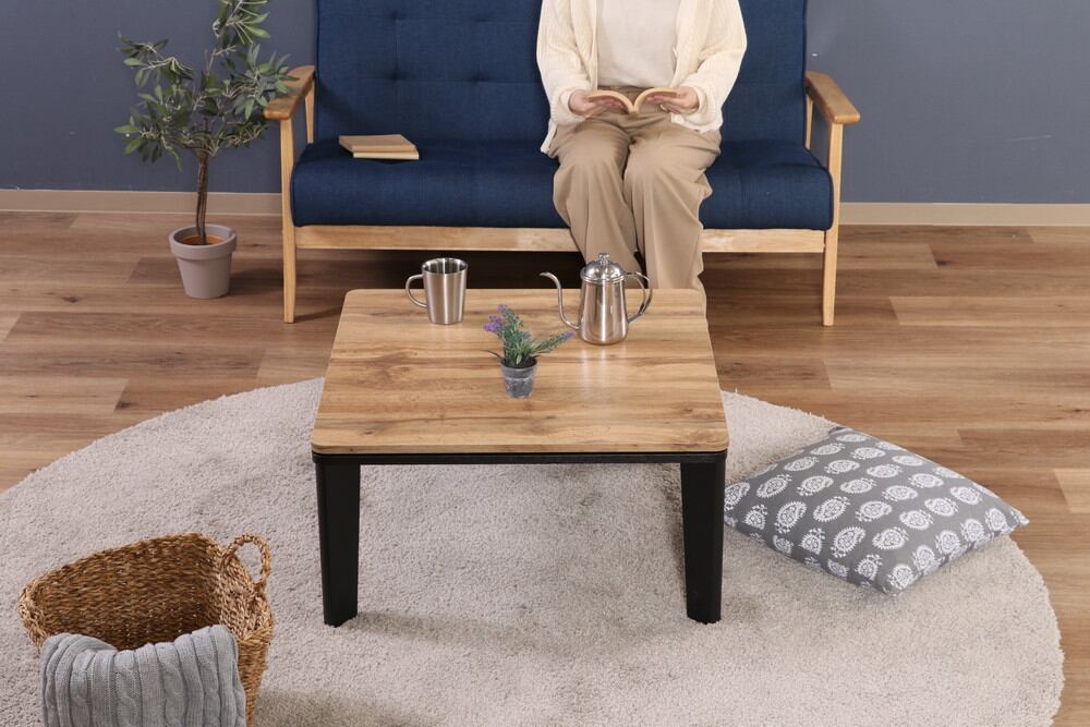 幅68×奥行68cmの場所を取らないコンパクトサイズです。1人で広々と、2人でも十分に使いやすいサイズ感です。専用のこたつ布団がセットになっています。ポケット付きなので、スマホやリモコンなど入れておくのにも便利です。まるで本物の天然木のような木の息遣いを感じられる天板で、空間に安心感をもたらします。布団を外せばセンターテーブルとしてオールシーズン使えます。
