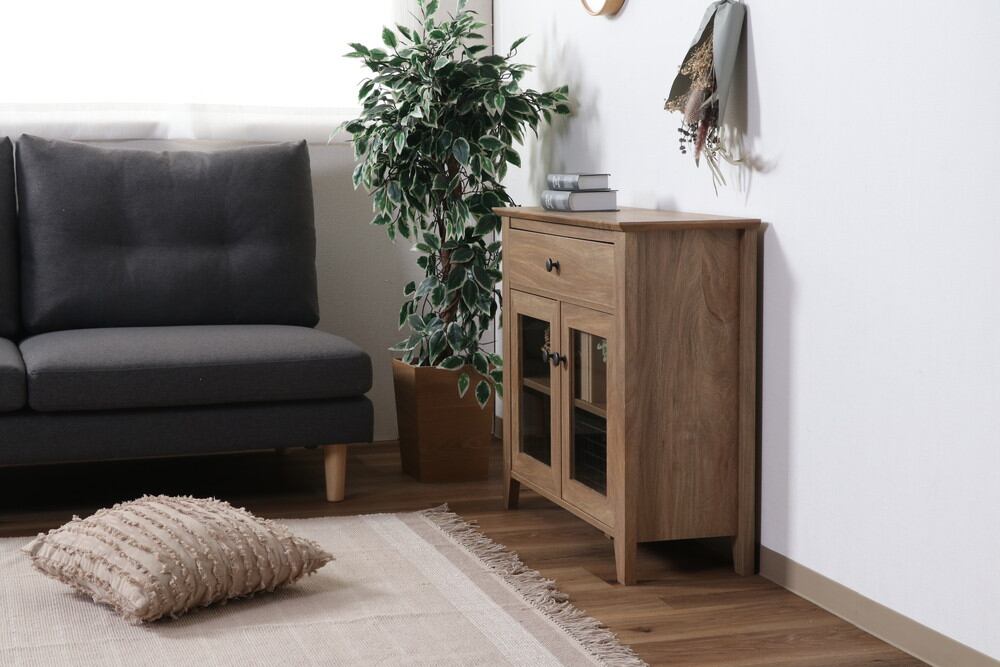 幅65.5×奥行27cmの4つに分かれた収納スペースには、食器類やリビング雑貨などをすっきり収納できます。収納するものに合わせて、棚の付け替えができます。幅64.5×奥行25cmの引き出しには大事な書類や小物などを収納できます。表面の木目が美しく、可能な限りネジ穴が見えないよう工夫されています。