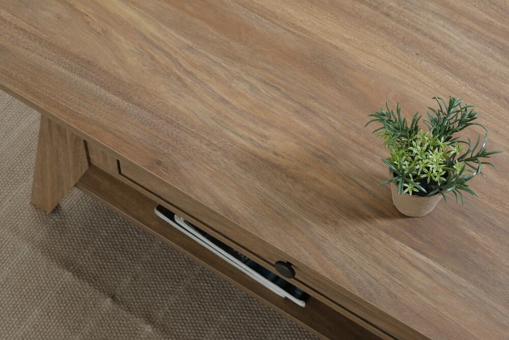 内寸幅50×奥行34cmの引き出しには、リビング小物などを収納できます。スライドレールなので引き出しやすさも◎有効高は15cmあり雑誌やブランケットなど少し大きめのものも片付く収納スペースです。あまり場所を取らずワンルームでも邪魔にならない程よいサイズ感です。表面の木目が美しく、可能な限りネジ穴が見えないよう工夫されています。