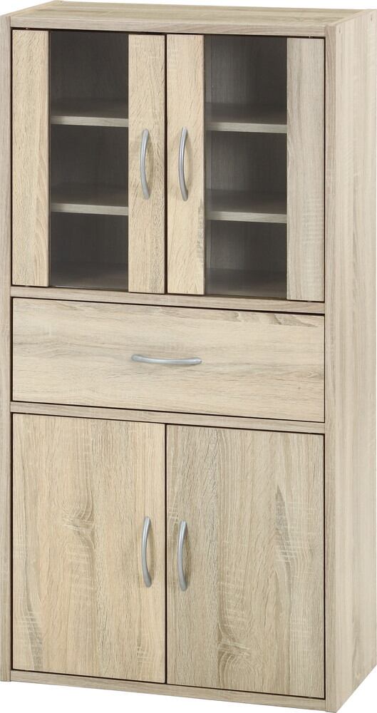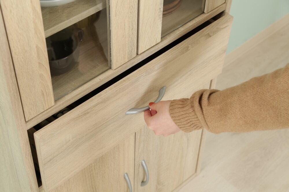 下段は大型の食器や缶詰、お菓子など隠しながらスッキリ収納できます。お好みの高さに合わせて、棚の付け替えができます。引き出しにはお箸やランチマットなど、かさばる小物をすっきり収納できます。すべての棚や引き出しには掴みやすいハンドル式の取っ手がついています。