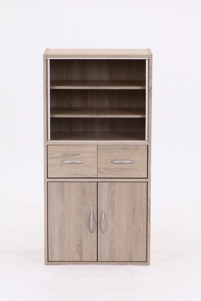 下段は大型の食器や缶詰、お菓子など隠しながらスッキリ収納できます。お好みの高さに合わせて、棚の付け替えができます。2杯の引き出しにはお箸やランチマットなど、かさばる小物をすっきり収納できます。棚や引き出しには掴みやすいハンドル式の取っ手がついています。