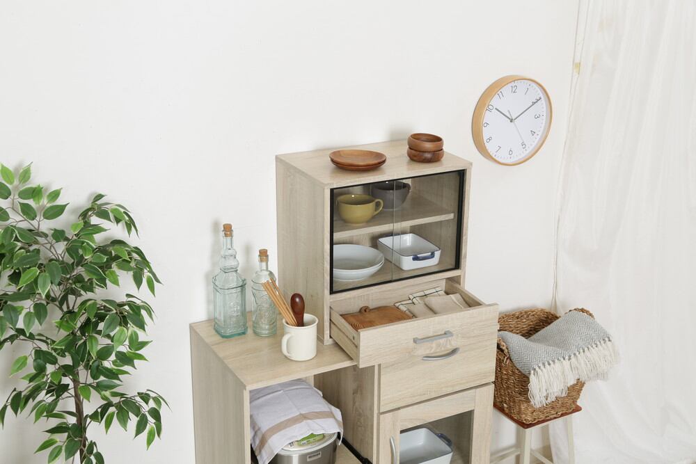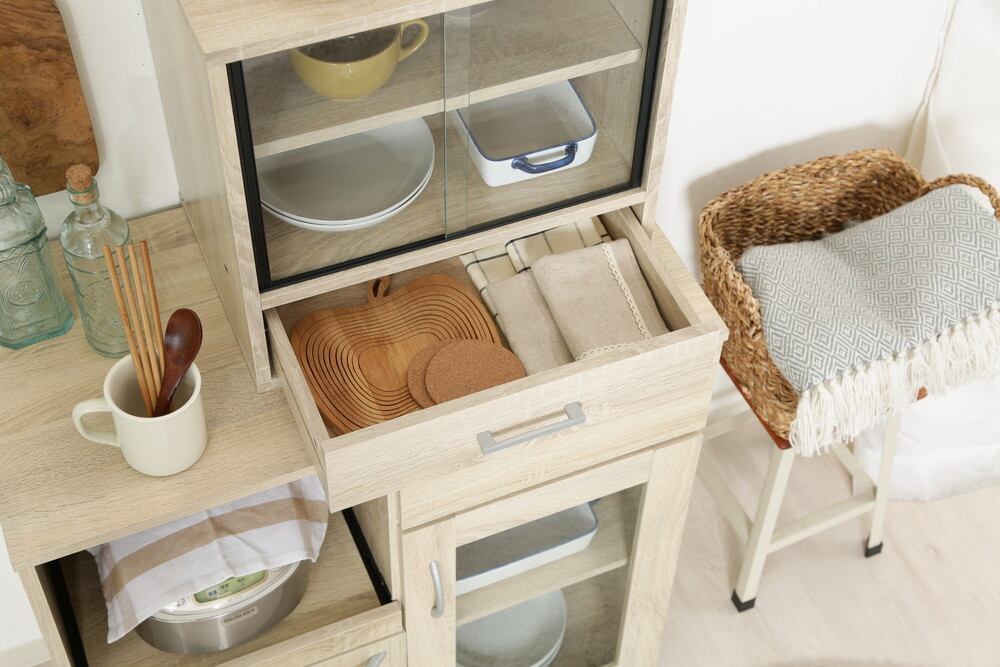棚板は高さを調節できる可動棚で、平たいお皿から背の高いコップまで無駄なく収納できます。扉はスライド式なので、狭いスペースにも置きやすく便利です。奥行が少ないスペースでも扉の場所をとらず、食器を出し入れすることができます。ガラス扉でどこに何があるのか一目で把握できます。圧迫感がなく空間を広く感じられます。引き出しにはお箸やランチマットなど、かさばる小物をすっきり収納できます。