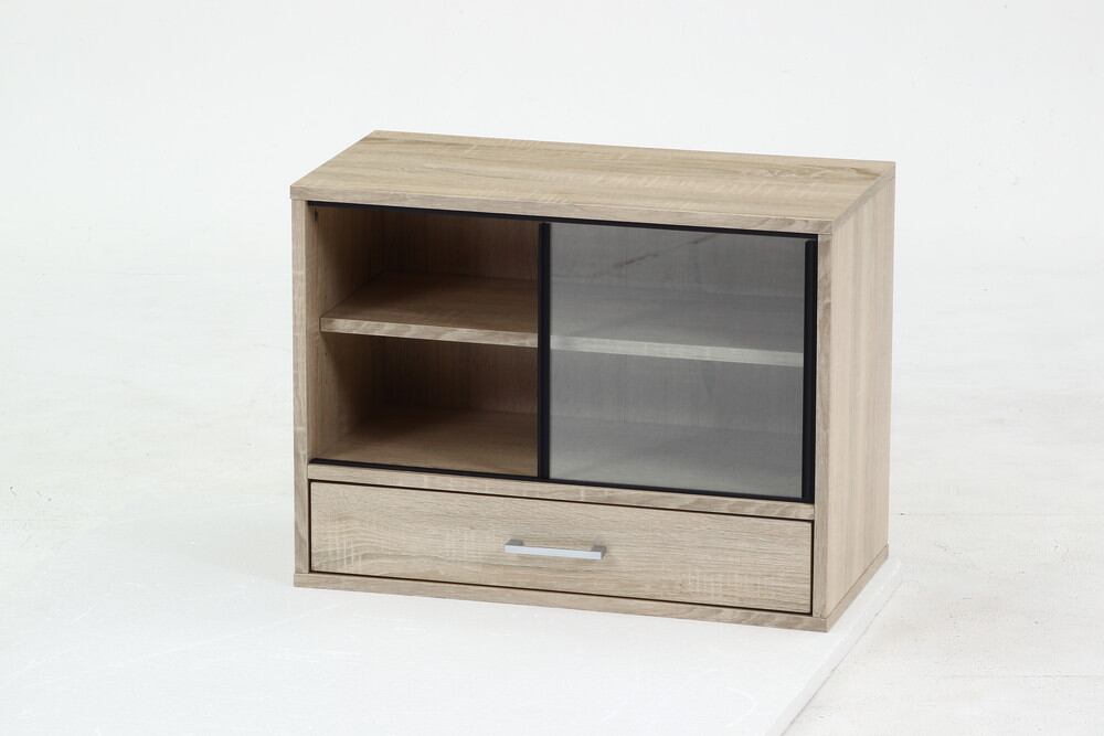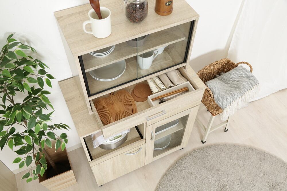 棚板は高さを調節できる可動棚で、平たいお皿から背の高いコップまで無駄なく収納できます。扉はスライド式なので、狭いスペースにも置きやすく便利です。奥行が少ないスペースでも扉の場所をとらず、食器を出し入れすることができます。ガラス扉でどこに何があるのか一目で把握できます。圧迫感がなく空間を広く感じられます。引き出しにはお箸やランチマットなど、かさばる小物をすっきり収納できます。